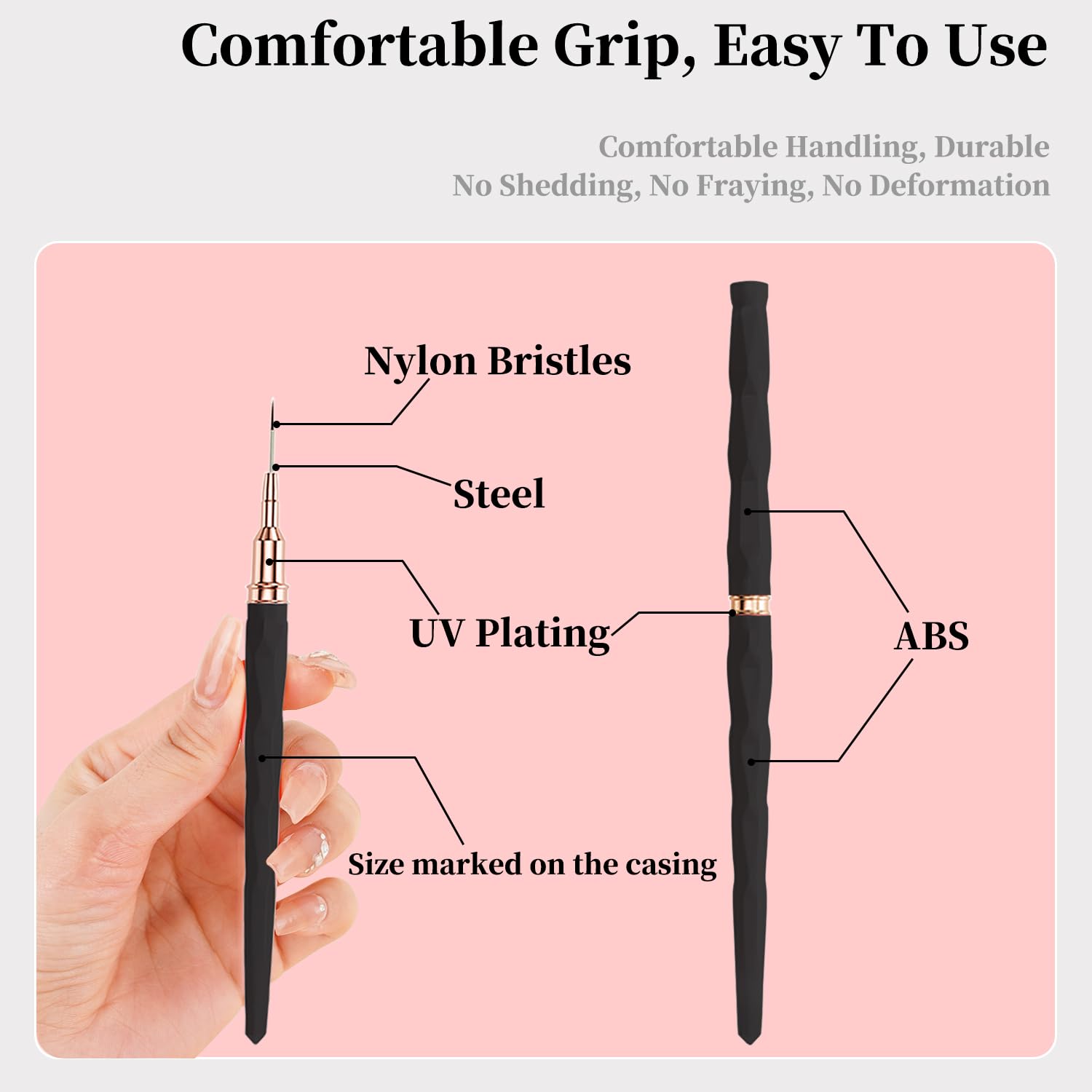 - Precise Application: Featuring ultra-fine bristles, our nail art liner brushes are designed for precise application of nail polish, gel, or other nail art materials. These thin nail art brushes are perfect for creating intricate designs and achieving a professional finish. Whether you're using them as a liner brush for nail gel or for designing nail polish for nail art, you can easily create detailed patterns.