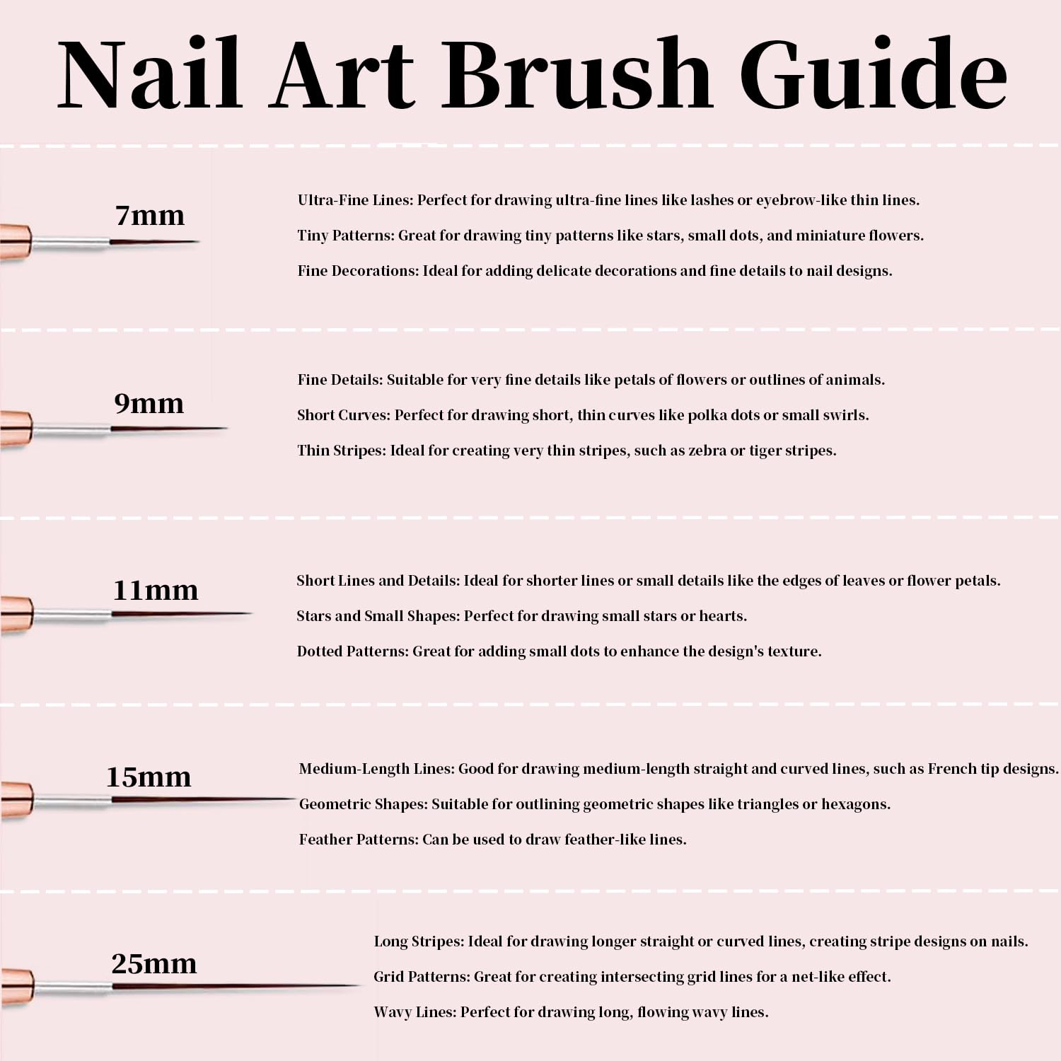- Multiple Bristle Sizes and Convenient Markings: Our transparent nail brush set includes high-quality synthetic fiber bristles in five different lengths: 7mm, 9mm, 11mm, 15mm, and 25mm. Each handle is clearly marked with the corresponding length, allowing you to easily select the right nail liner brush for your needs. These nail art brushes are perfect for achieving precise designs with your favorite nail polish or gel polish.