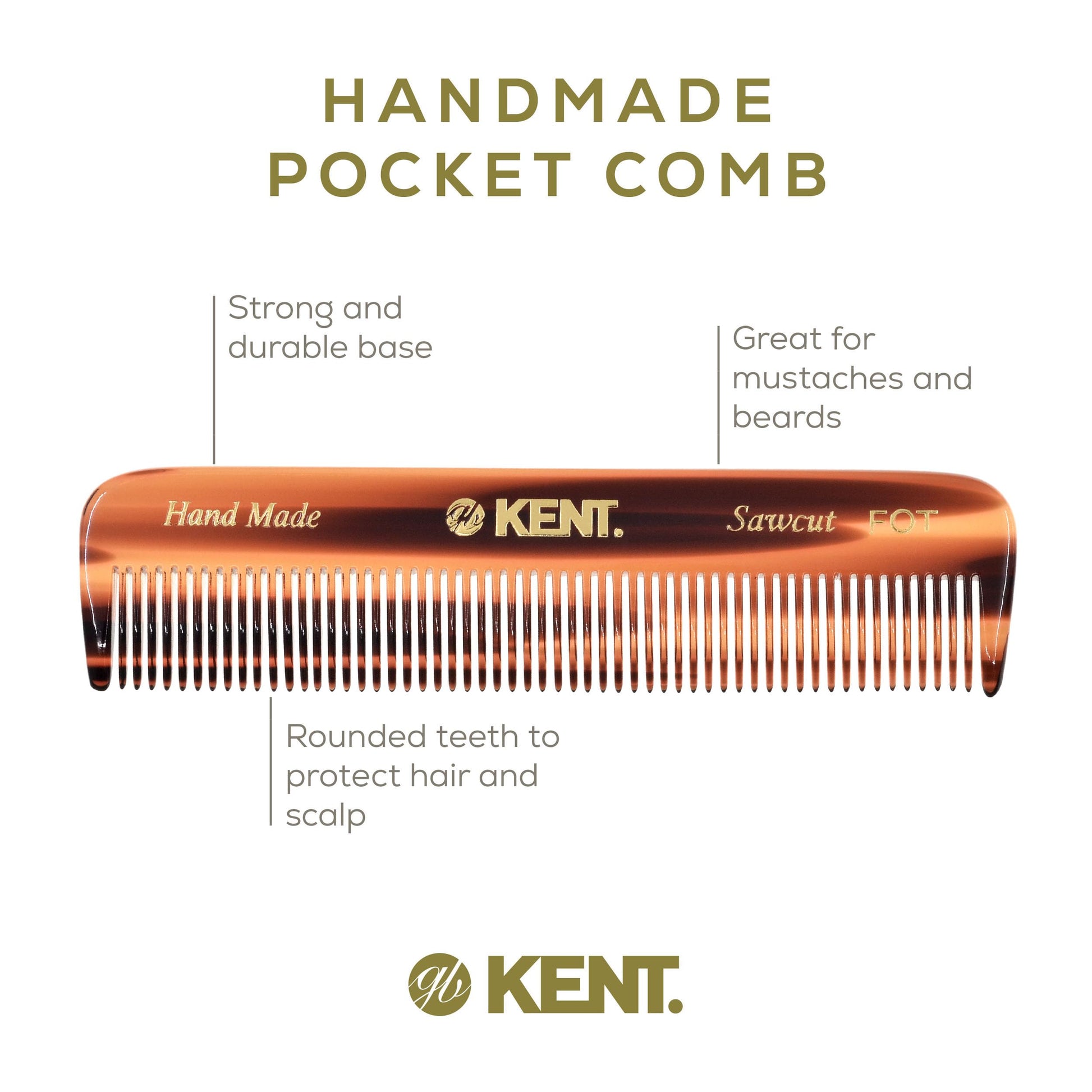 Kent FOT Tortoise Fine Tooth Comb for Men - Handmade Pocket Comb for Travel, Styling, Fine or Thinning Hair, Mustache and Beard Care Handpolished Saw-Cut Made in England