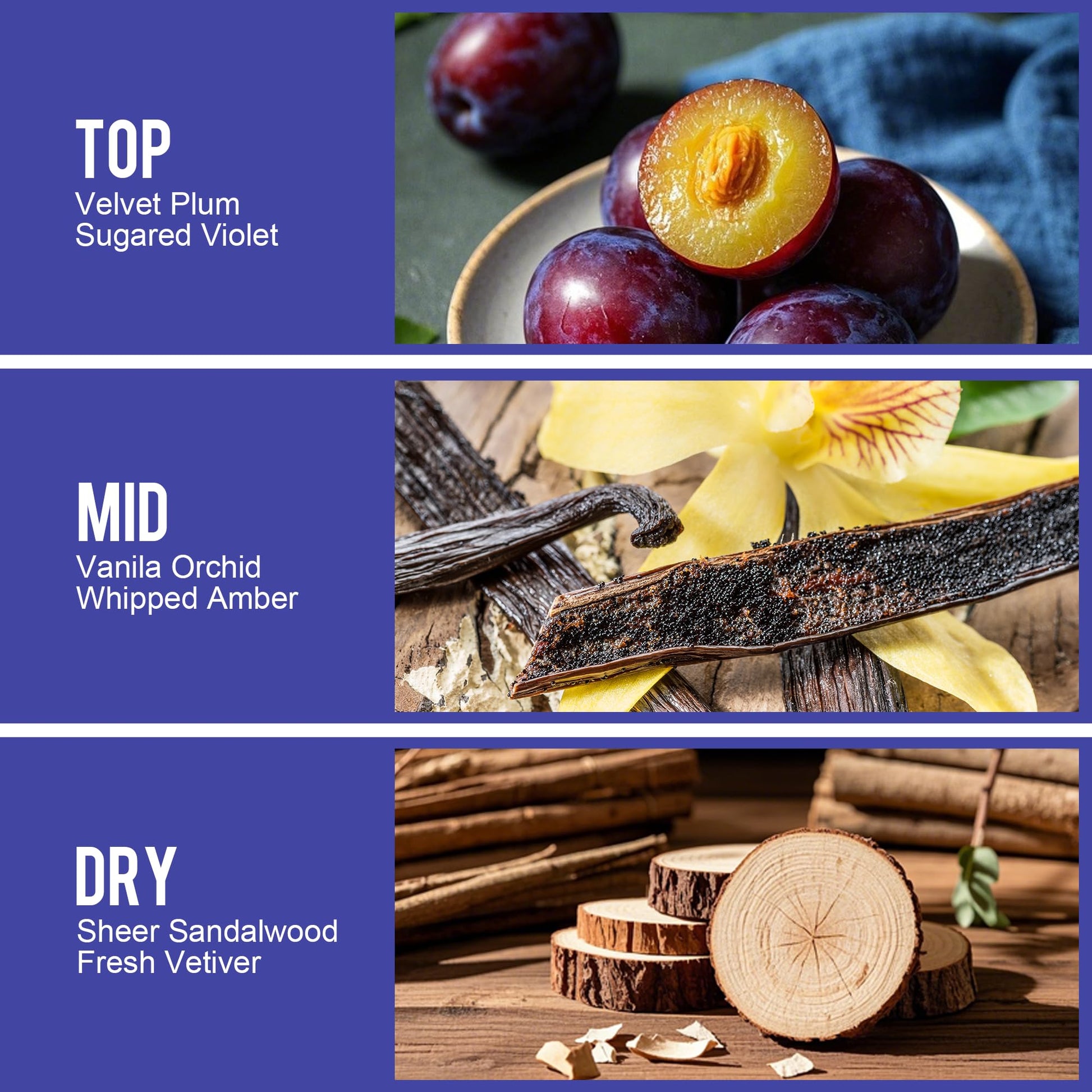 - 【Long-Lasting Fragrance】 takes the soft and sweet Velvet Plum and Sugared Violet as the top note, the elegant and fresh Vanilla Orchid Wheeled Amber as the middle note, and the romantic Sheer Sandalwood Fresh Vetiver as the keynote. The fresh, charming and exquisite feeling, filled with exotic fruits, makes the aroma more charming and long-lasting.