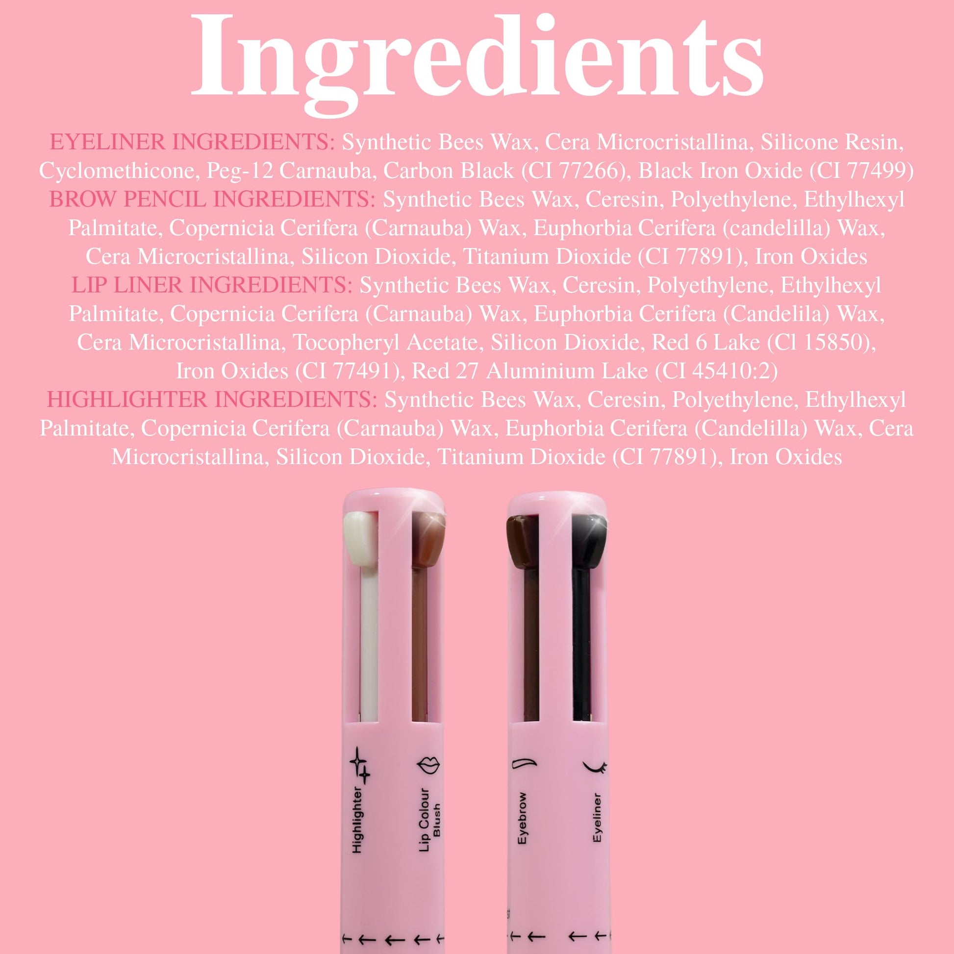 - 4-IN-1 MAKEUP PEN - Designed to be used for lips, eyes, brows and face. Perfect for touch-ups on the go. Featuring a black eyeliner pencil, blush pink lip liner, dark brown eyebrow pencil and pearlescent white highlighter pencil all in one!