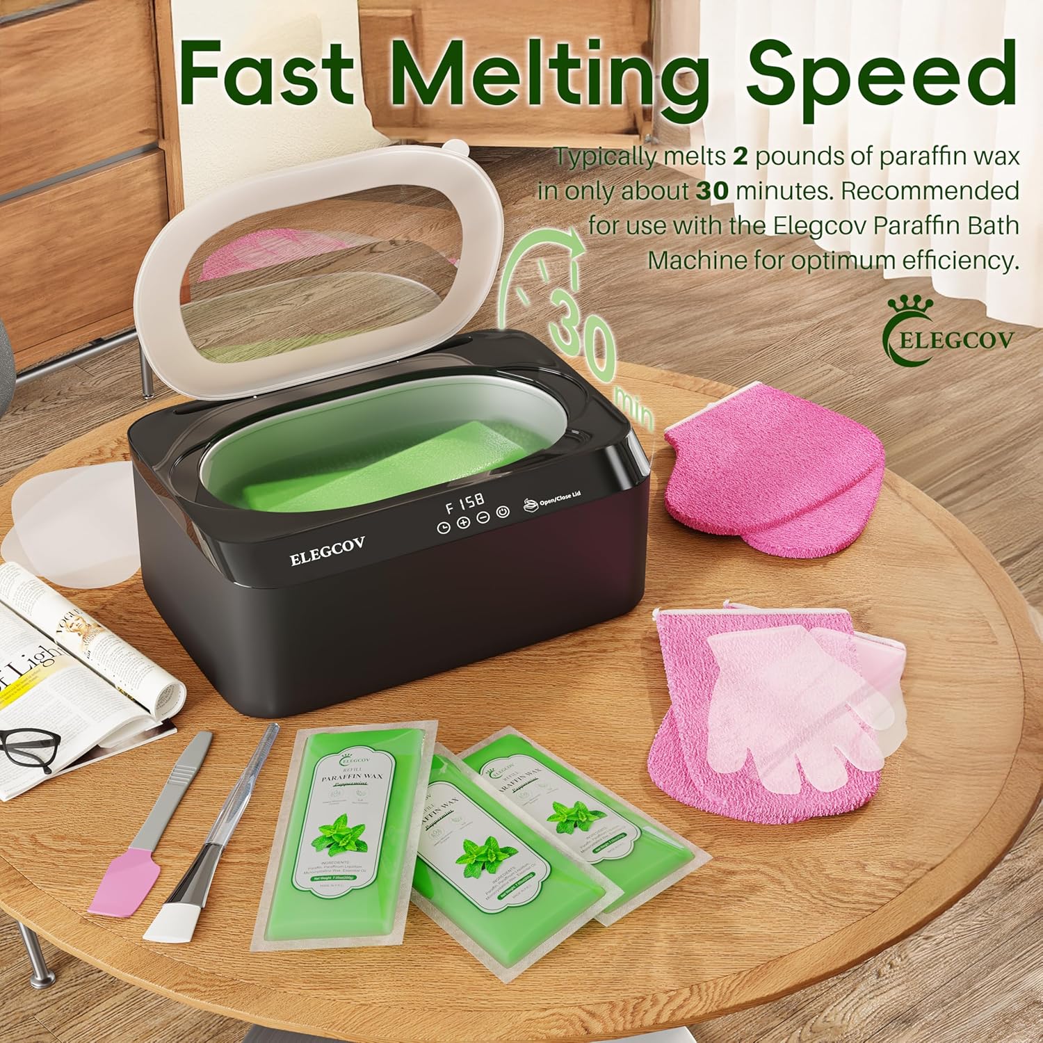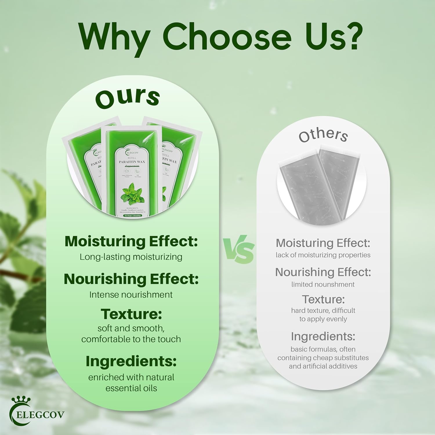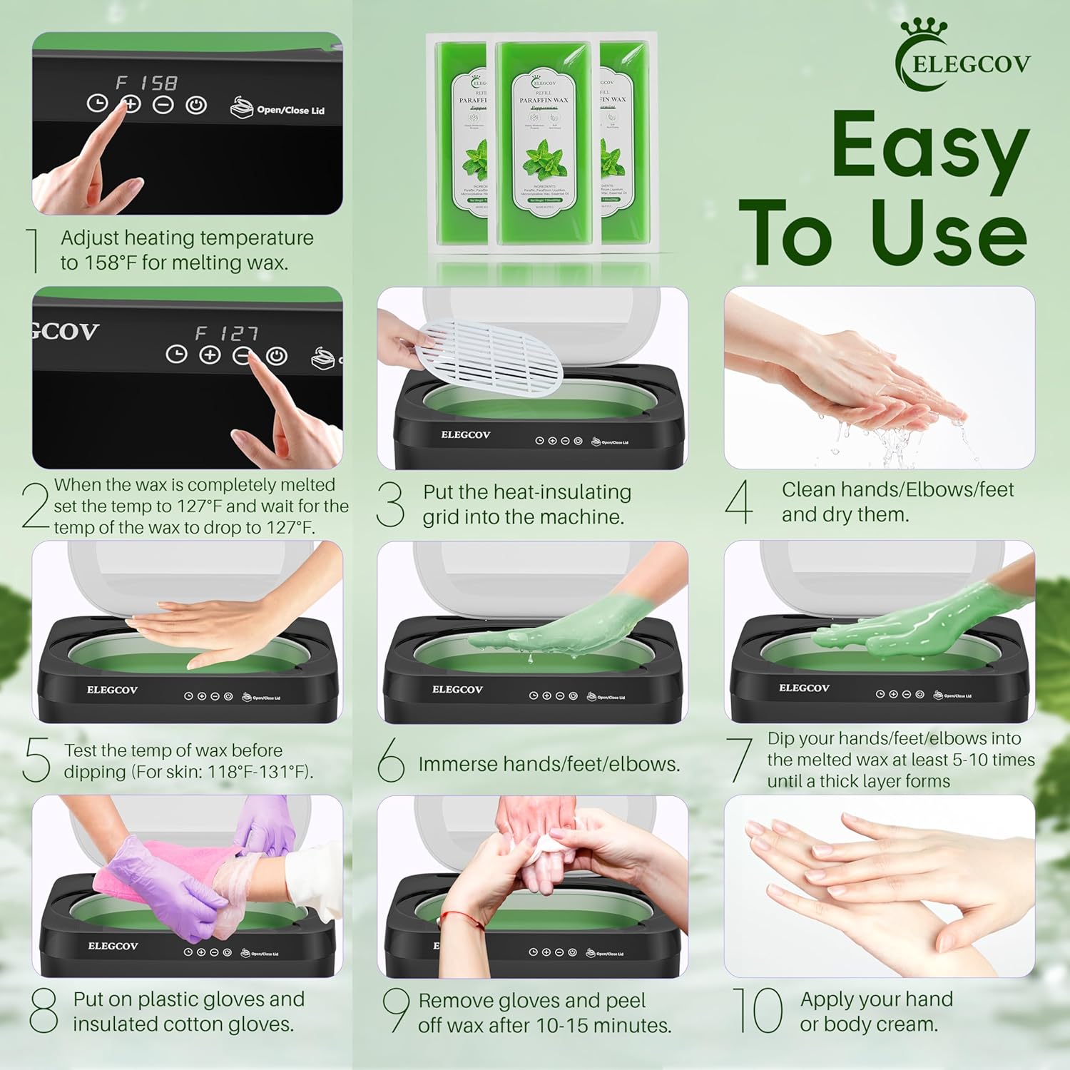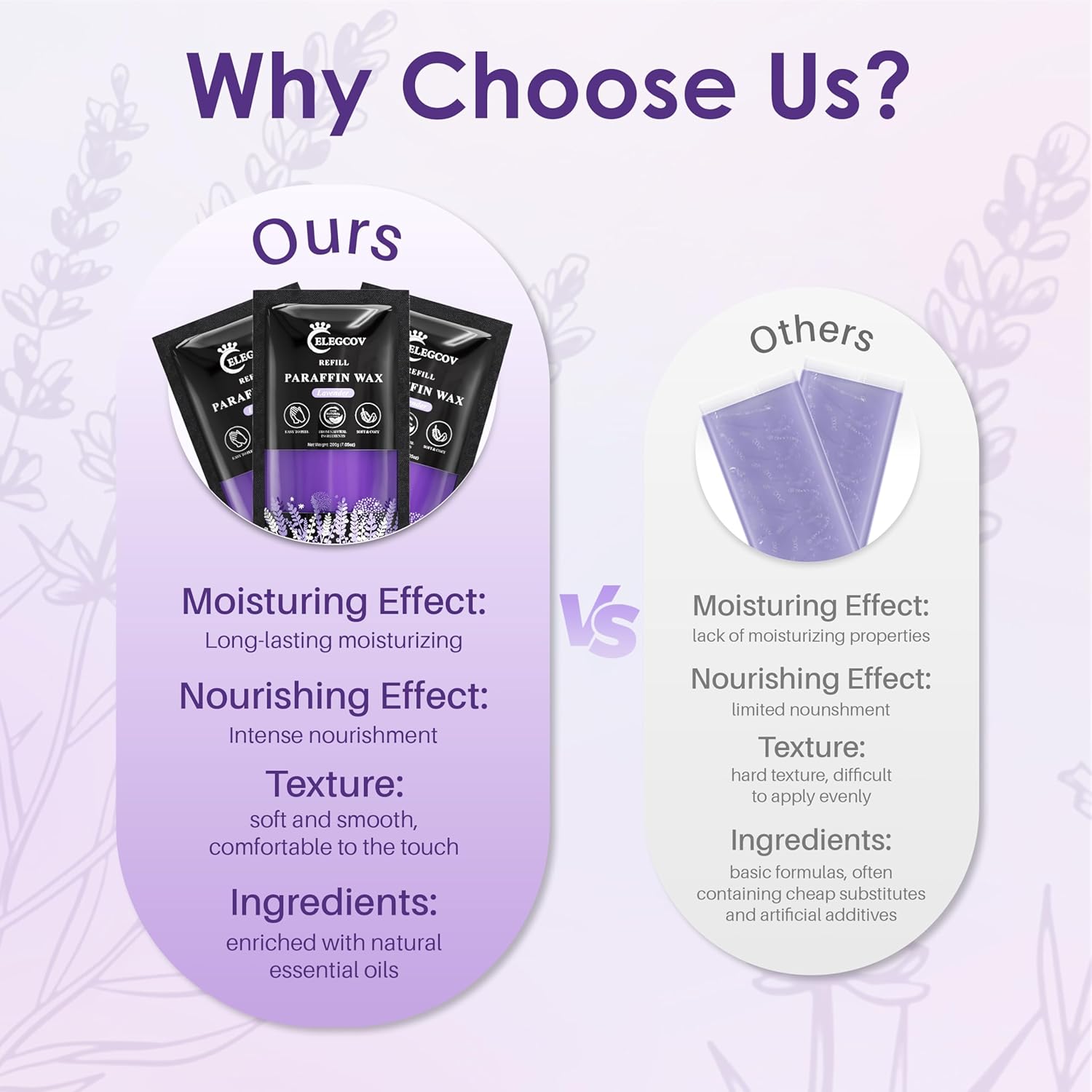 - Easy to Use with Any Paraffin Bath: These lavender paraffin wax refills are seamlessly compatible with most paraffin wax baths, especially when paired with the use of our Elegcov's paraffin wax machine, which melts evenly and quickly, ensuring a spa-like experience at home