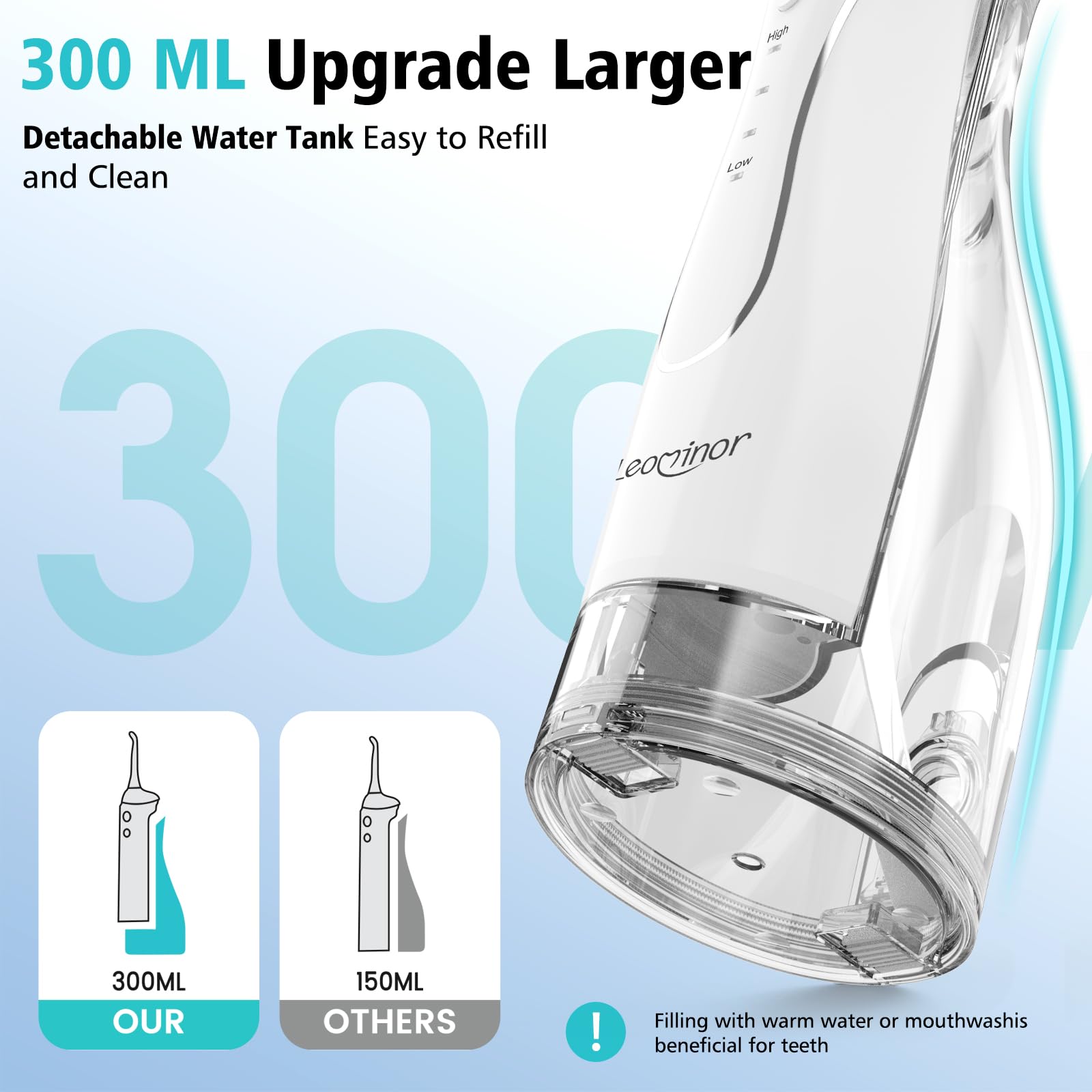 Leominor Water Dental Flosser Pick for Teeth, 300ML Portable Oral Irrigator Upgraded Tank Removable,IPX7 Waterproof, Rechargeable Travel Teeth Cleaner, Professional Electric Flossing (White)