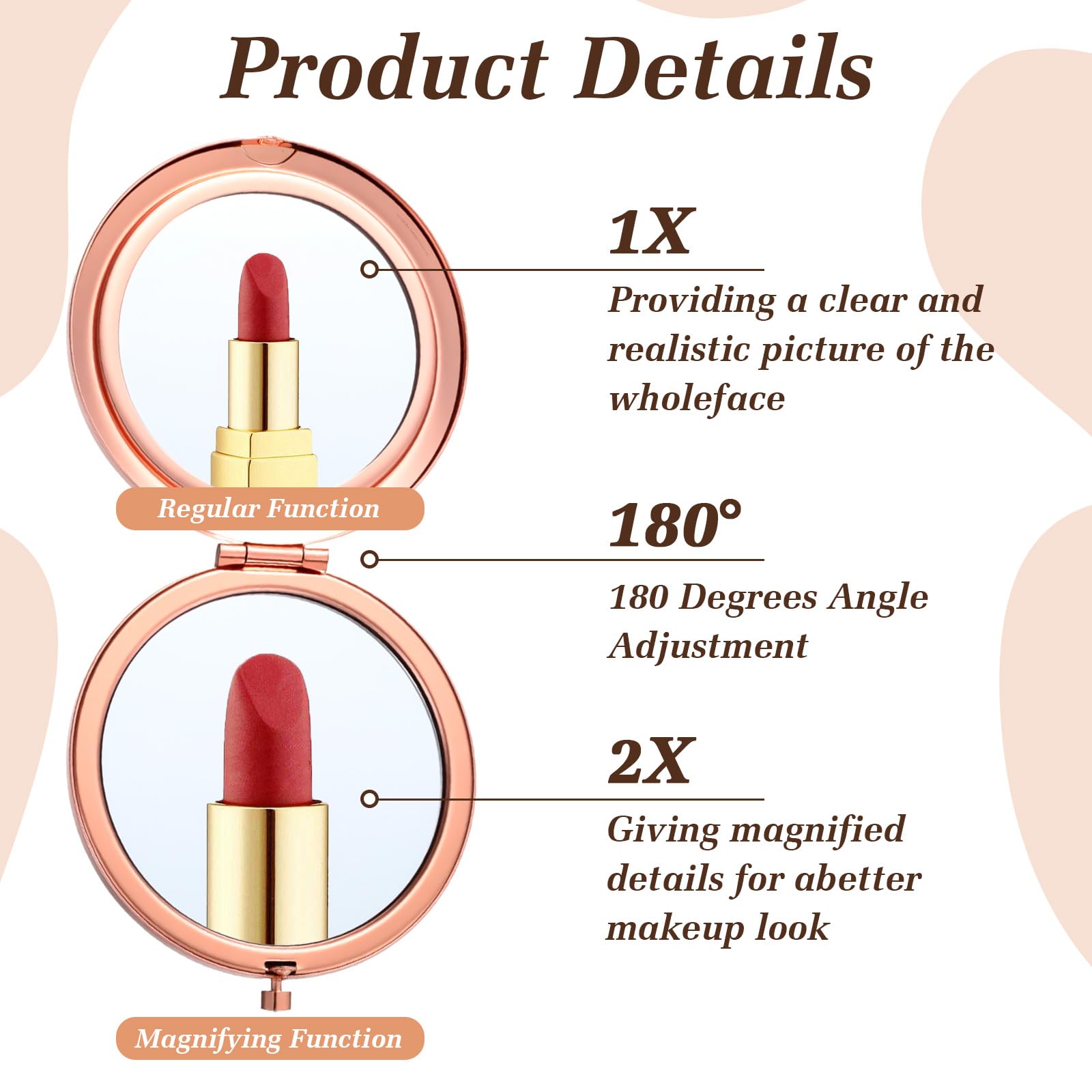 - Double Sided Mirror Design: there are 2 kinds of functions of the rose gold compact mirror, one for an ordinary mirror, which can be applied to check the overall makeup, and the other one for 2 x magnification effect, so you can check the details, meeting your daily needs