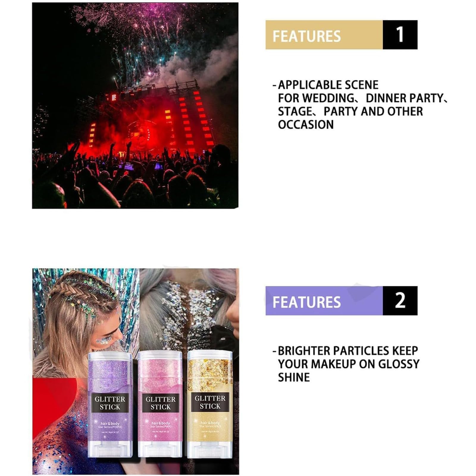 - Quick-Dry Non-Tacky Wear: Say goodbye to sticky, messy glitter, Our glitter stick for hair and body dries within a mere 30 seconds, leaving you with a smooth, non-sticky finish, Once fully set, it can even resist light moisture transfer, ensuring your glitter stays put all day or night