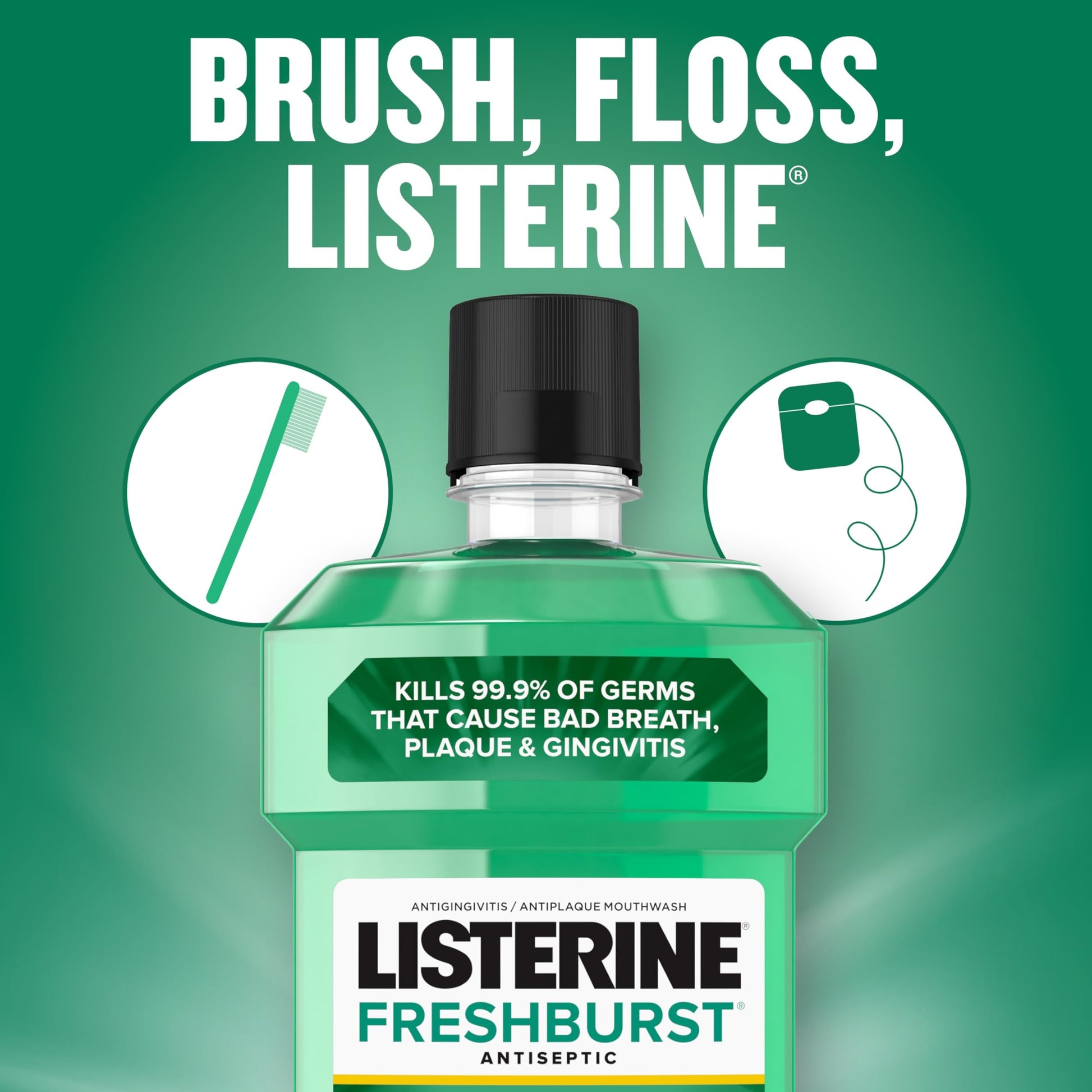 Details: Protect your mouth from germs and get fresh breath with Listerine Freshburst Antiseptic Mouthwash. It kills 99.9% of germs that cause bad breath, plaque, and gingivitis for a fresher and cleaner mouth than brushing alone. Clinically shown to reduce 52 percent more plaque and 21 percent more gingivitis than brushing and flossing alone, this antiseptic mouthwash provides a deep clean that cares for your whole mouth. Listerine Freshburst Mouthwash is a recipient of the ADA Seal of Acceptance for fighting plaque and gingivitis. The great-tasting Freshburst spearmint flavor of this antiseptic mouthwash leaves your mouth feeling clean and fresh. With approximately 12 days in this 500-mL bottle, achieve maximum results by rinsing with this refreshing mouthwash for 30 seconds twice a day†, both morning and night, for 24-hour germ protection. *Based on laboratory testing. Data on file. Stock up with this 2-pack of 500 mL bottles of mouthwash.