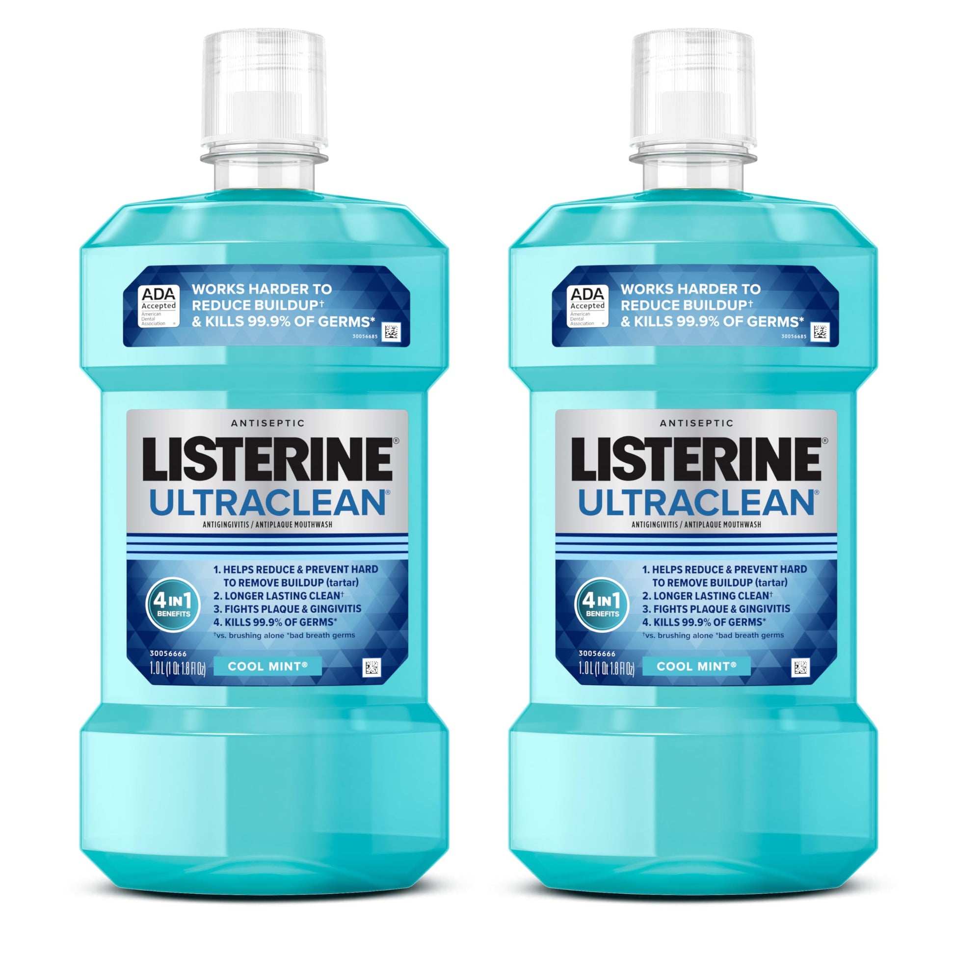 - Twin pack of 1-Liter bottles of Listerine Ultraclean Cool Mint Antiseptic Gingivitis Treatment Mouthwash to fight tartar buildup & kill 99.9% of germs that cause bad breath, plaque & gingivitis