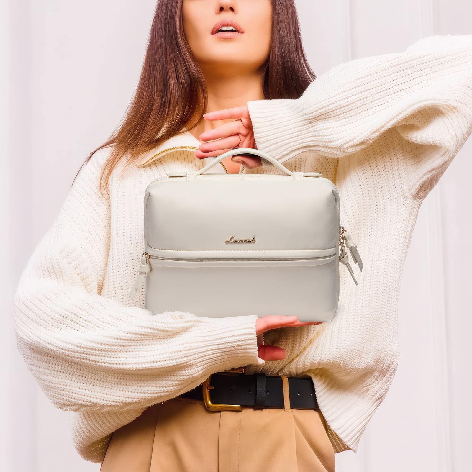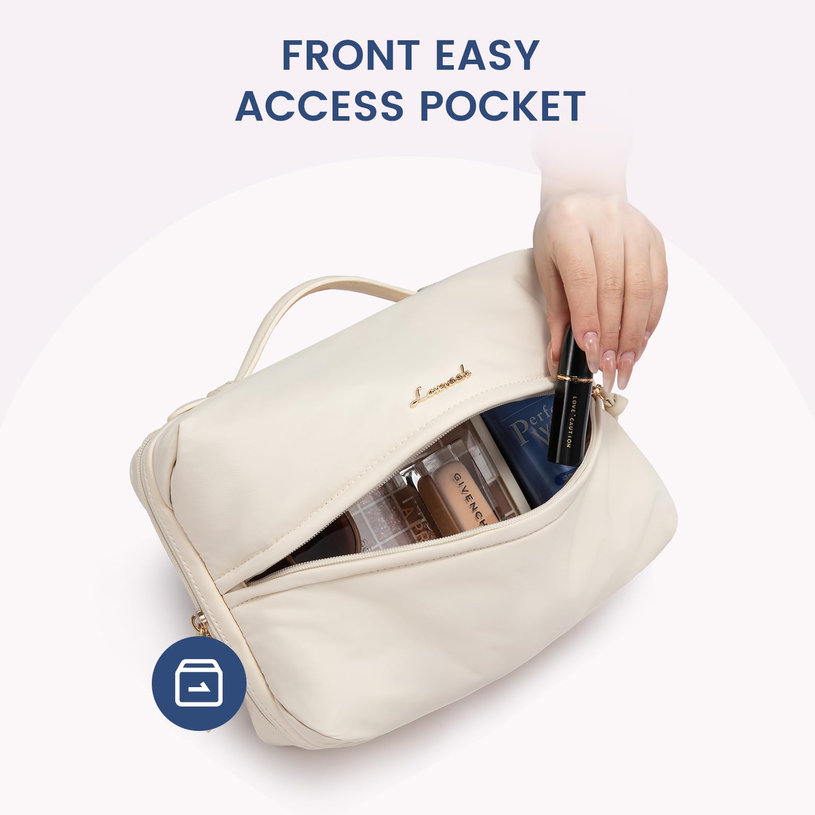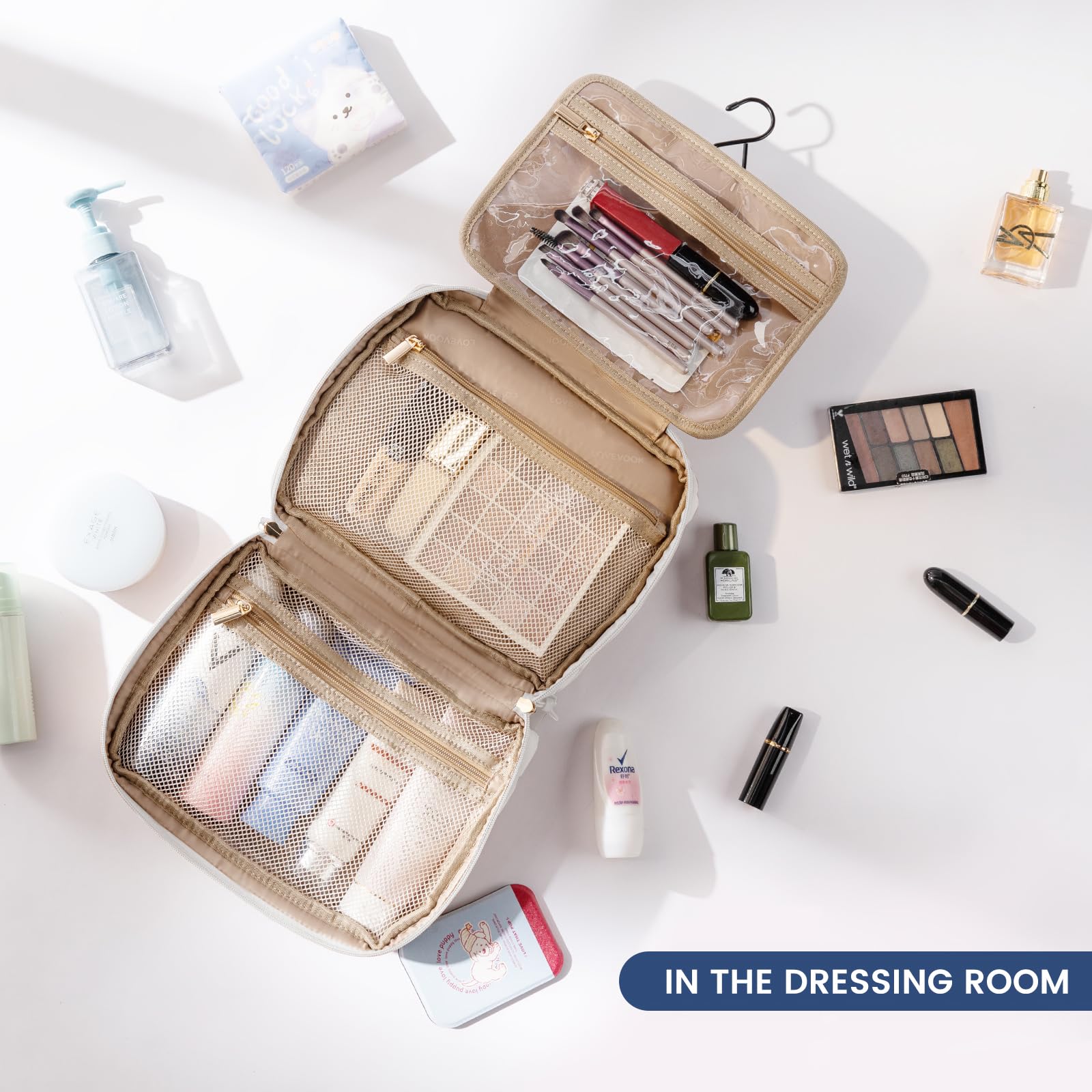LOVEVOOK Travel Toiletry Bag With Hanging Hook for Women, Puffy Cosmetic Makeup Bag Organizer with Vegan Leather Handle for Accessories, Essentials, Toiletries, Off white
