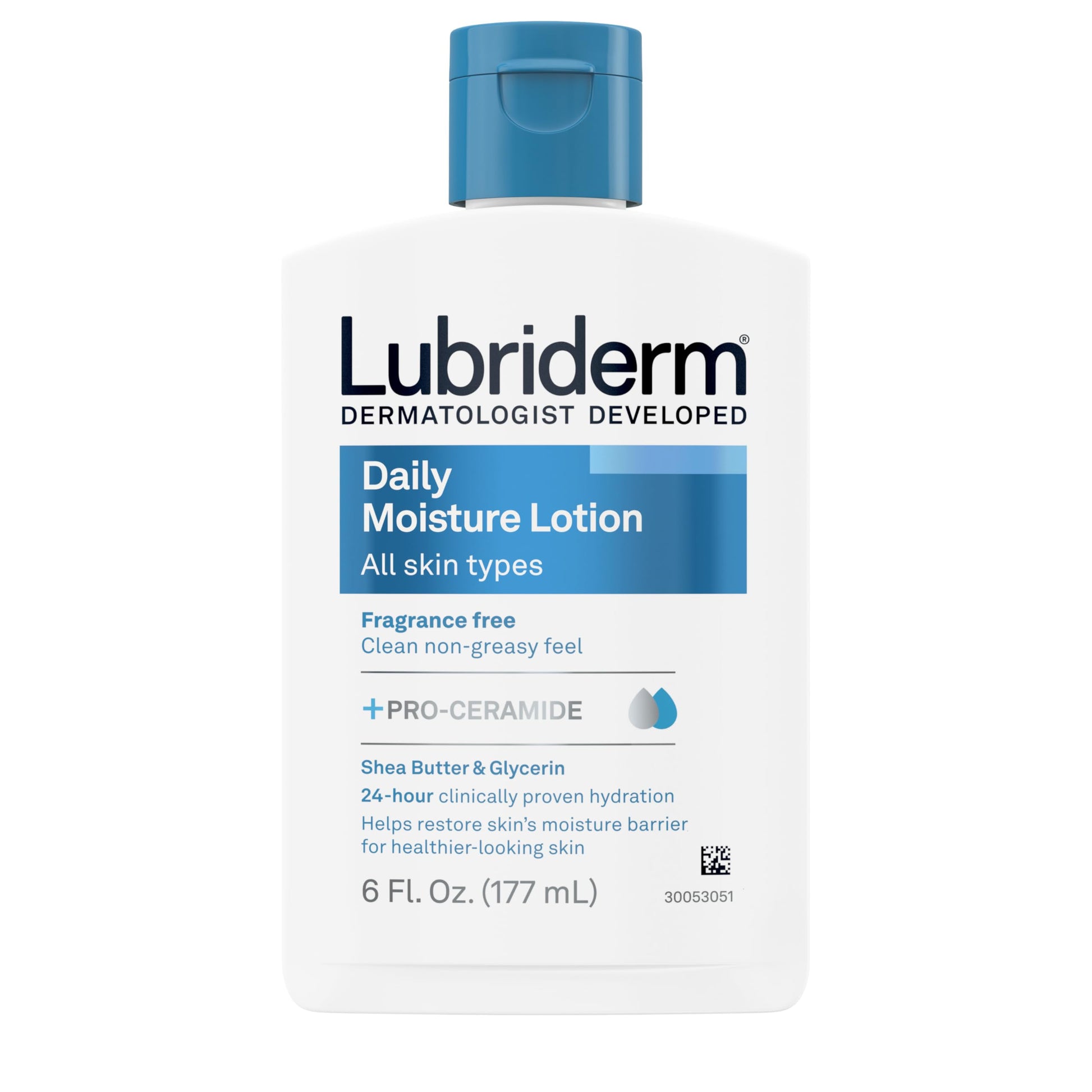 - 6-fluid ounce bottle of Lubriderm Fragrance Free Daily Moisture Lotion + Pro-Ceramide, Shea Butter and Glycerin to help restore skin's moisture barrier for healthier-looking skin