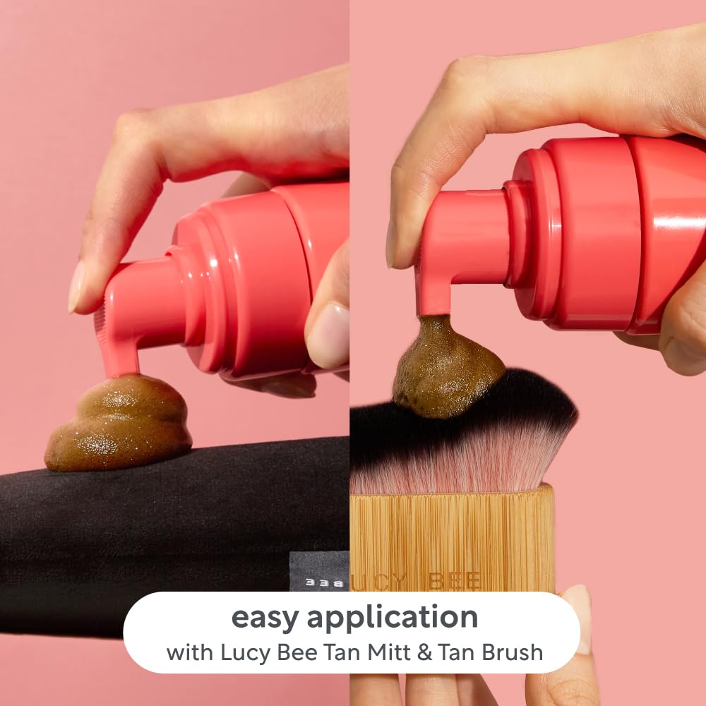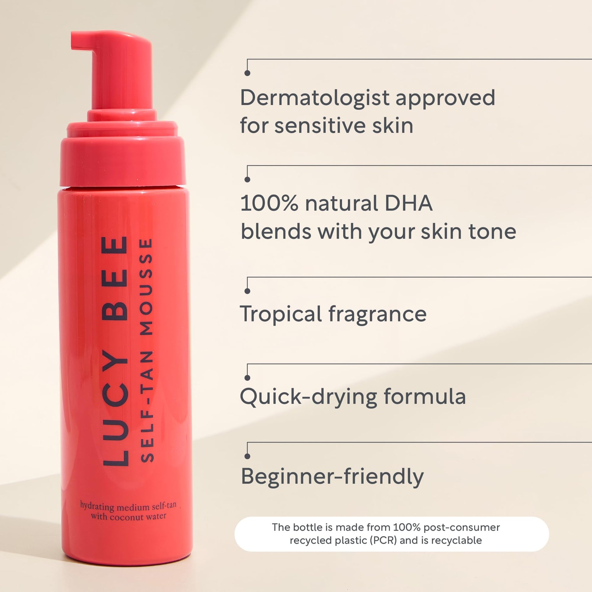 Lucy Bee Self Tan Mousse, Customizable Medium Self Tanning Foam, Natural Looking Tan, Quick-Drying, Dermatologist Approved for Sensitive Skin, Hydrating Coconut Water, Tropical Scent, 6.76 fl oz