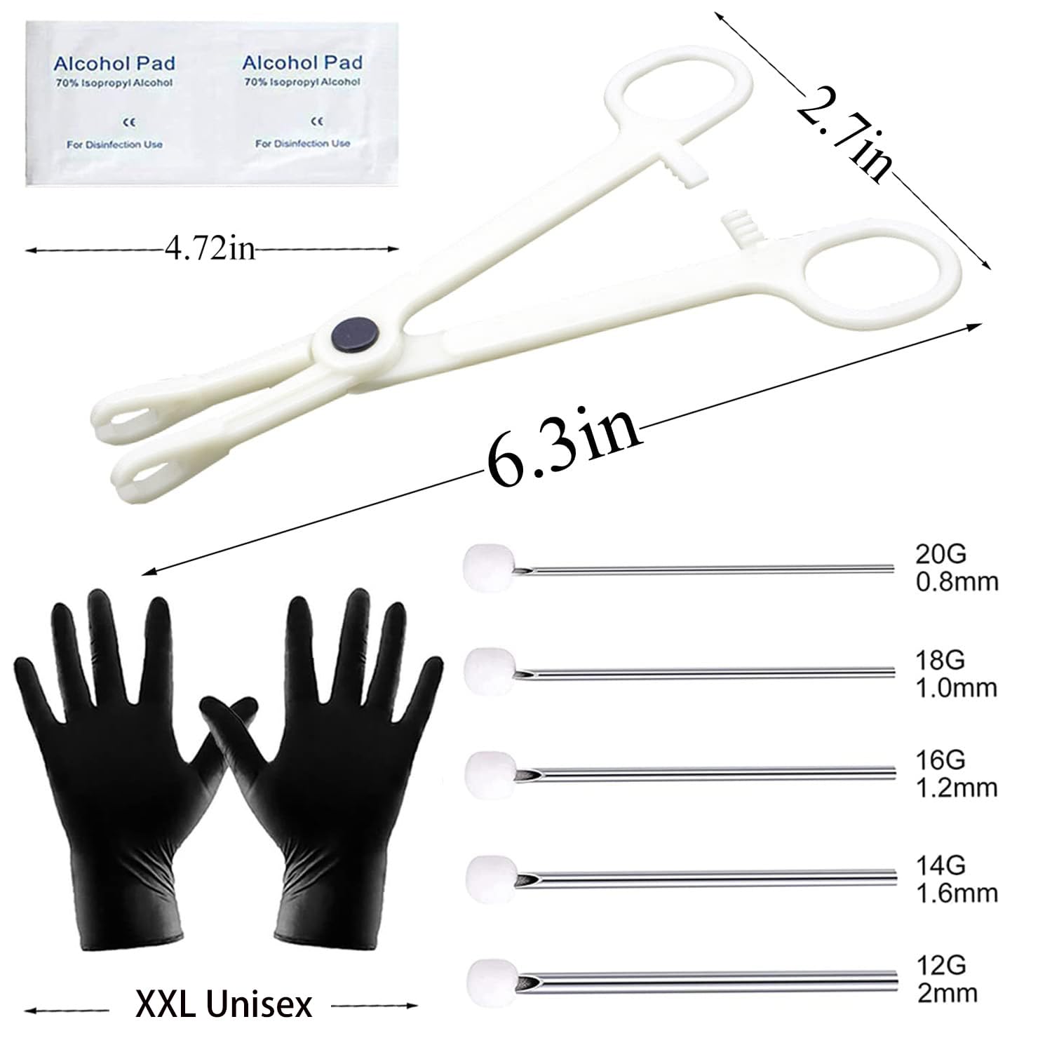 - ✅[PERFECT PIERCING KIT] 35 pieces piercing kit, including 1 round opening septum forceps clamp plier, 1 triangular opening septum forcep clamp plier, 25 pieces mixed 12G 14G 16G 18G 20G piercing needles, 2 gloves and 6 pieces clean pads. Professional Kit Includes Everything You Need.