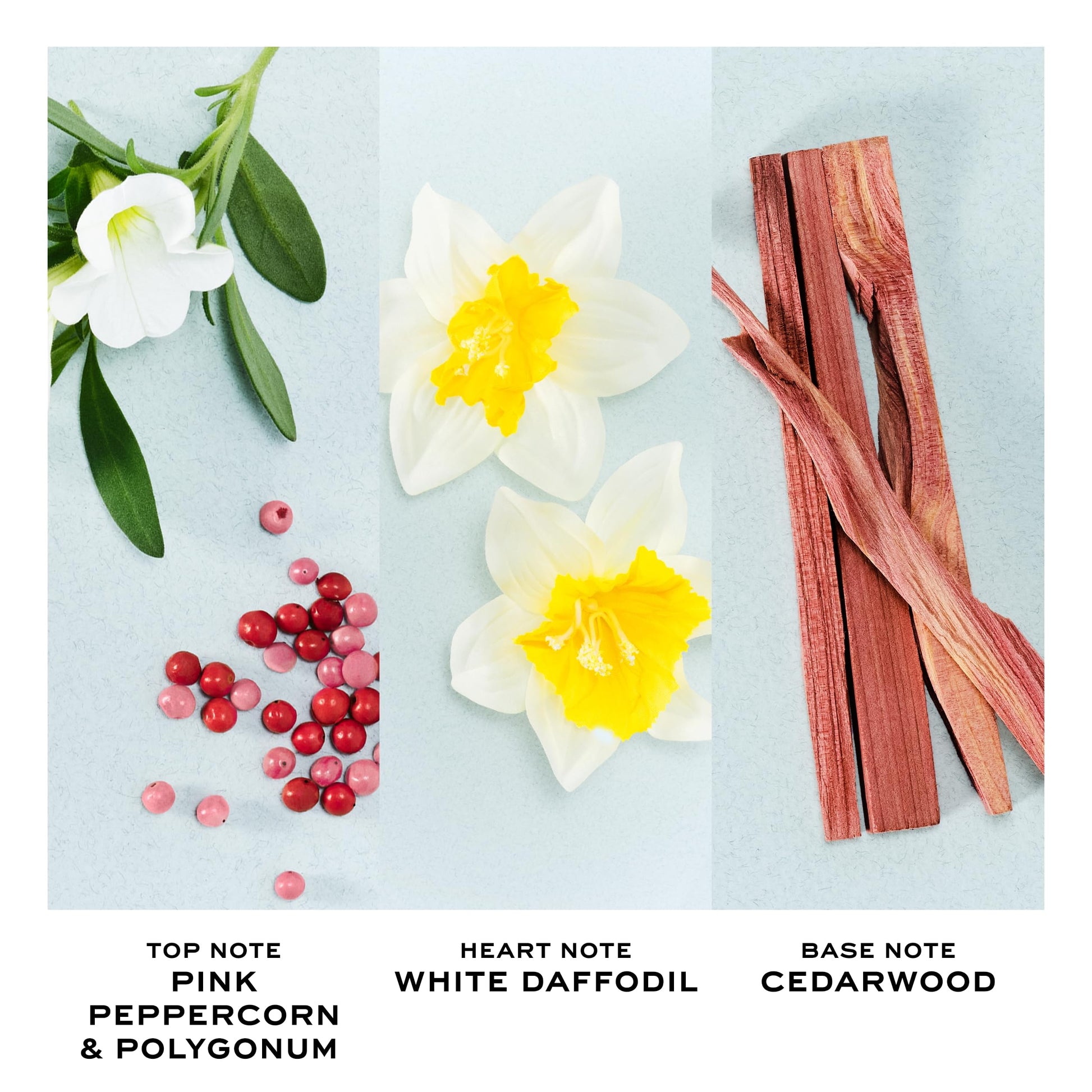 - Top Notes: Pink Peppercorn, Polygonum; Heart Notes: White Daffodil; Base Notes: Cedarwood