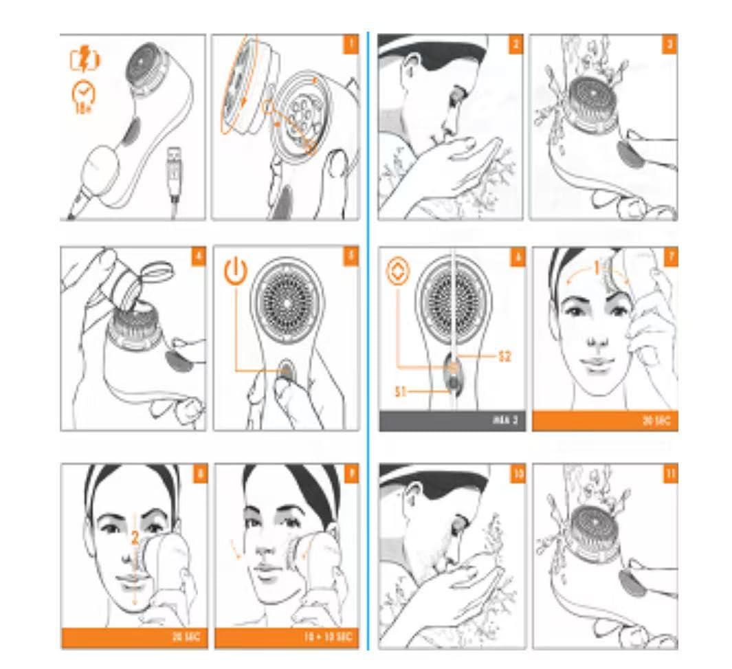 - Apply cleanser to wet brush head and gently move the brush in a circular motion on damp facial skin