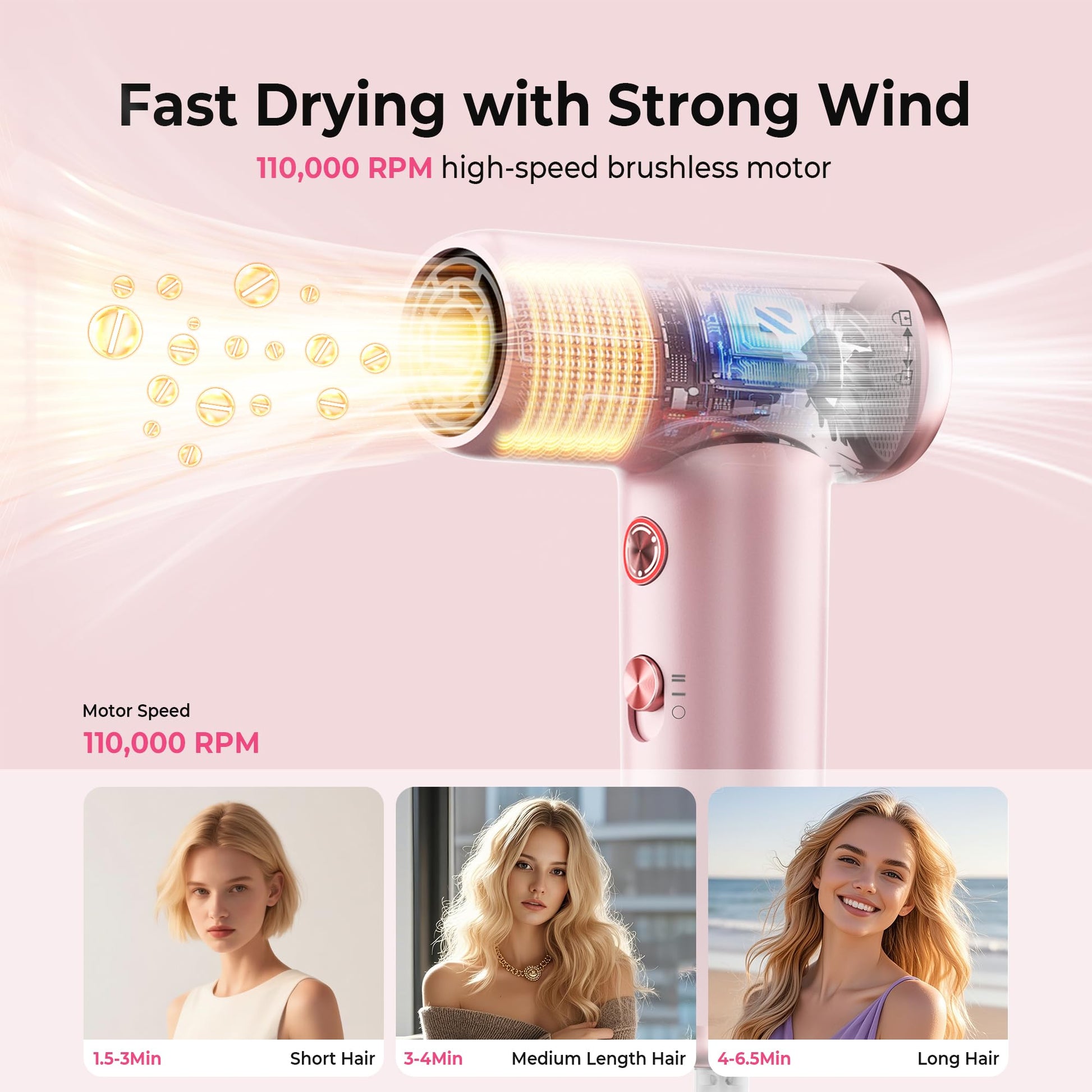 - Salon-Grade Drying Power, Harnessing a professional 110,000 RPM motor, our mini hair dryer blasts intense airflow to dry even thick, long hair in ~6 minutes flat. Experience salon-worthy speed without compromise – whether you’re styling curls or taming frizz, the travel hair dryer delivers consistent, powerful performance for all hair types while saving precious time.