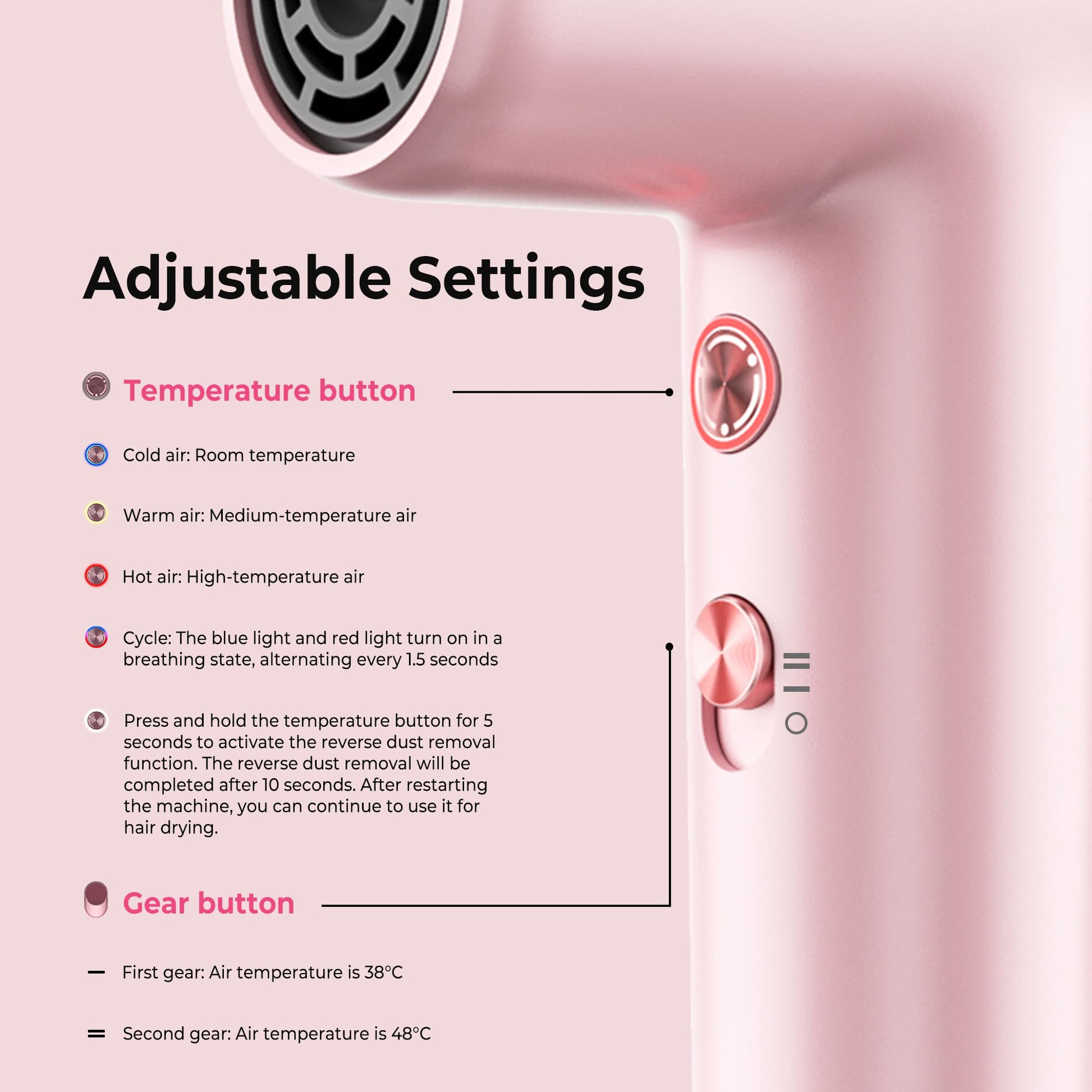 - Self-Cleaning & Advanced Protection, Mini hair dryer can hold the temp button 3 seconds to activate reverse airflow dust-cleaning mode. The 360° magnetic nozzle offers versatile styling, while mini blow dryer has dual safeguards – smart heat monitoring and auto-reset thermal cutoff – The travel blow dryer mini can prevent overheating damage. (If you have any question of our mini hair dryer, please feel free to tell us.)