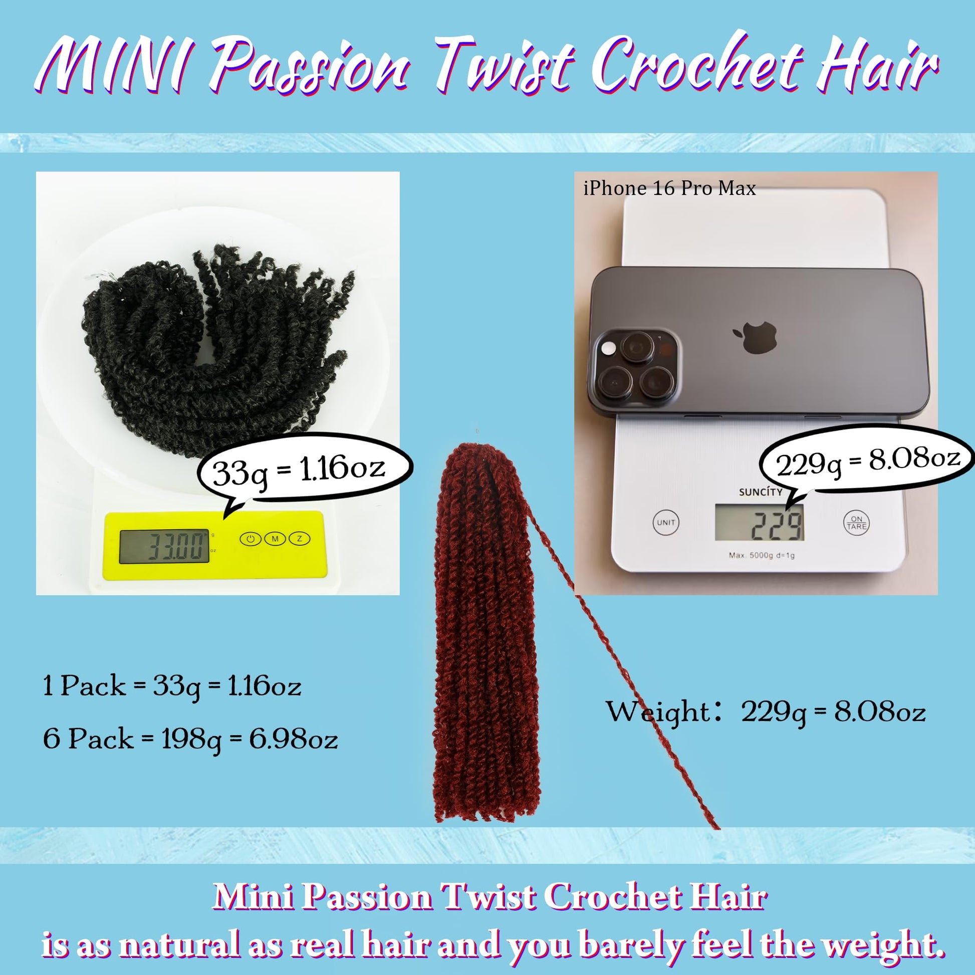 - Mini Passion Twist Hair Feature:Elastic,Value for Money,Free Cut,Easy to Install,Super Lightweight,Super Soft,Skin Friendly,No Smell,Tangle-Free,Long-lasting,High Resilience,Non-reflective, More Natural;