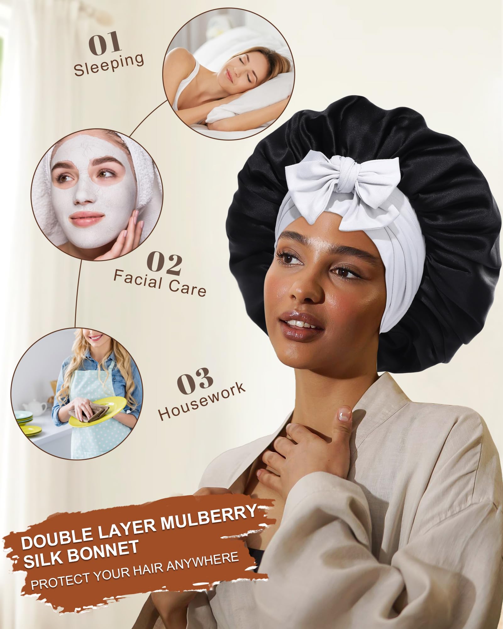 - 100% MULBERRY SILK BONNET SCRUNCHIE SET: Made from smooth, soft, and breathable mulberry silk, this hair care set enhances your sleeping experience. Wearing it while sleeping is a real pleasure. Perfect for upgrading your nighttime hair routine