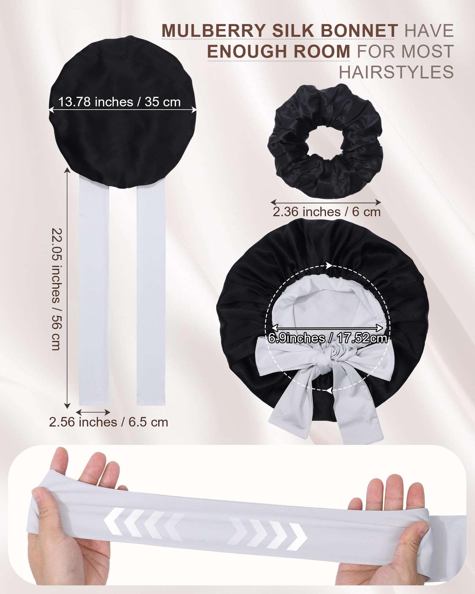 - MULBERRY SILK BONNET WITH ELASTIC TIE BAND FITS HEAD BETTER: The silk hair Bonnet for Sleeping has ties that make it easy to adjust the size for a perfect fit, keeping it in place all night long and making it comfortable to wear without leaving marks