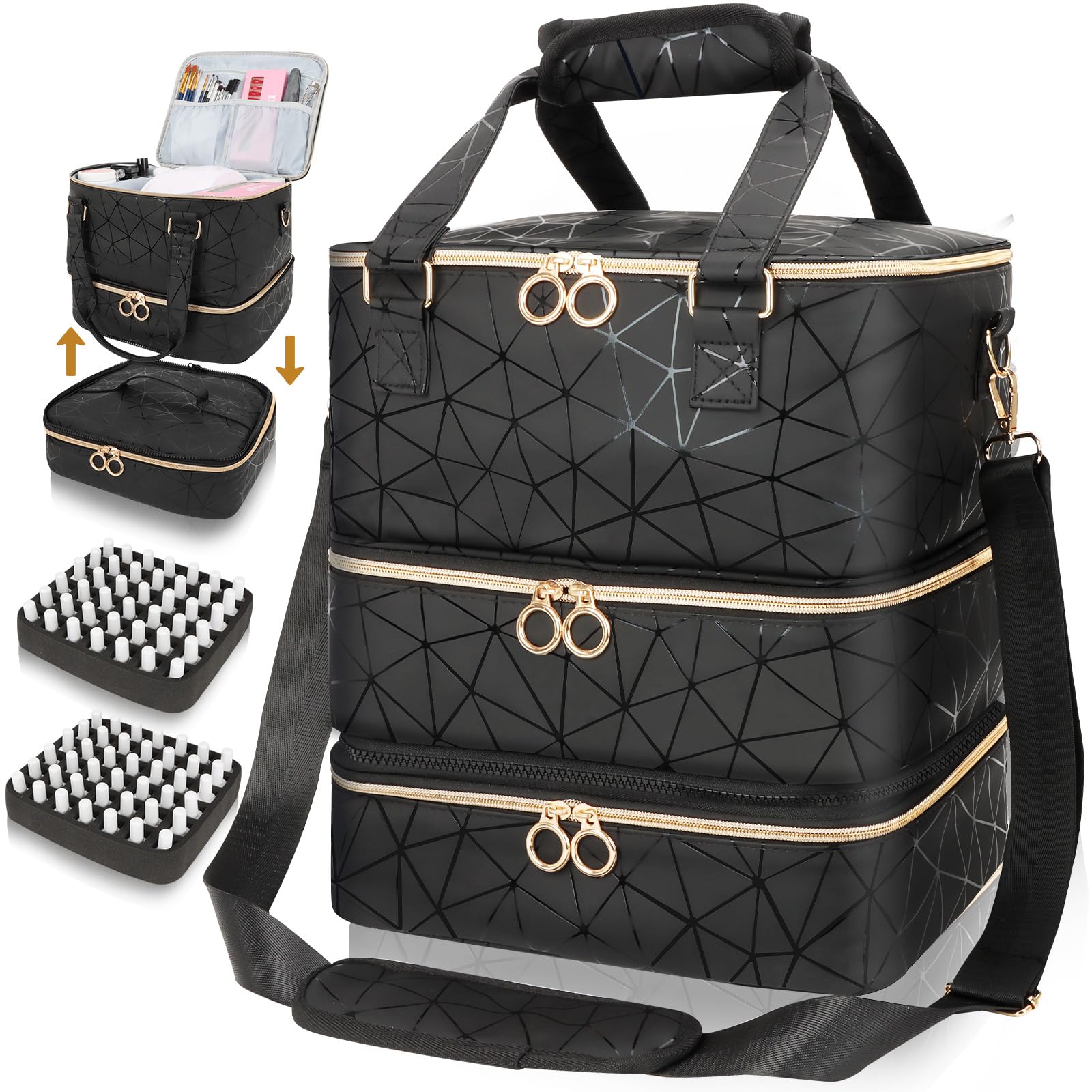 Nail Polish Organizer Bag Holds 84 Bottles & Nail Lamp, 3 Layers Nail Kit Storage Carrying Case Pu Leather, Large Nail Supplies Organizer With Shoulder Strap, Portable Travel Nail Bag For Nail Tech