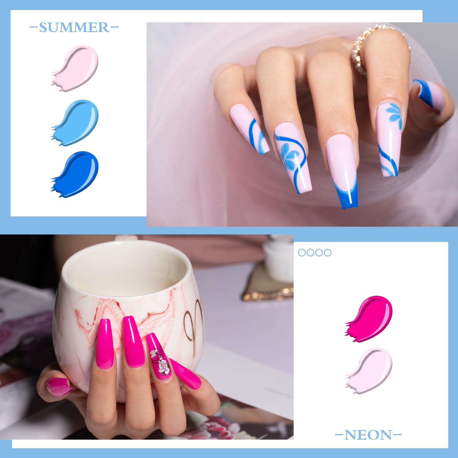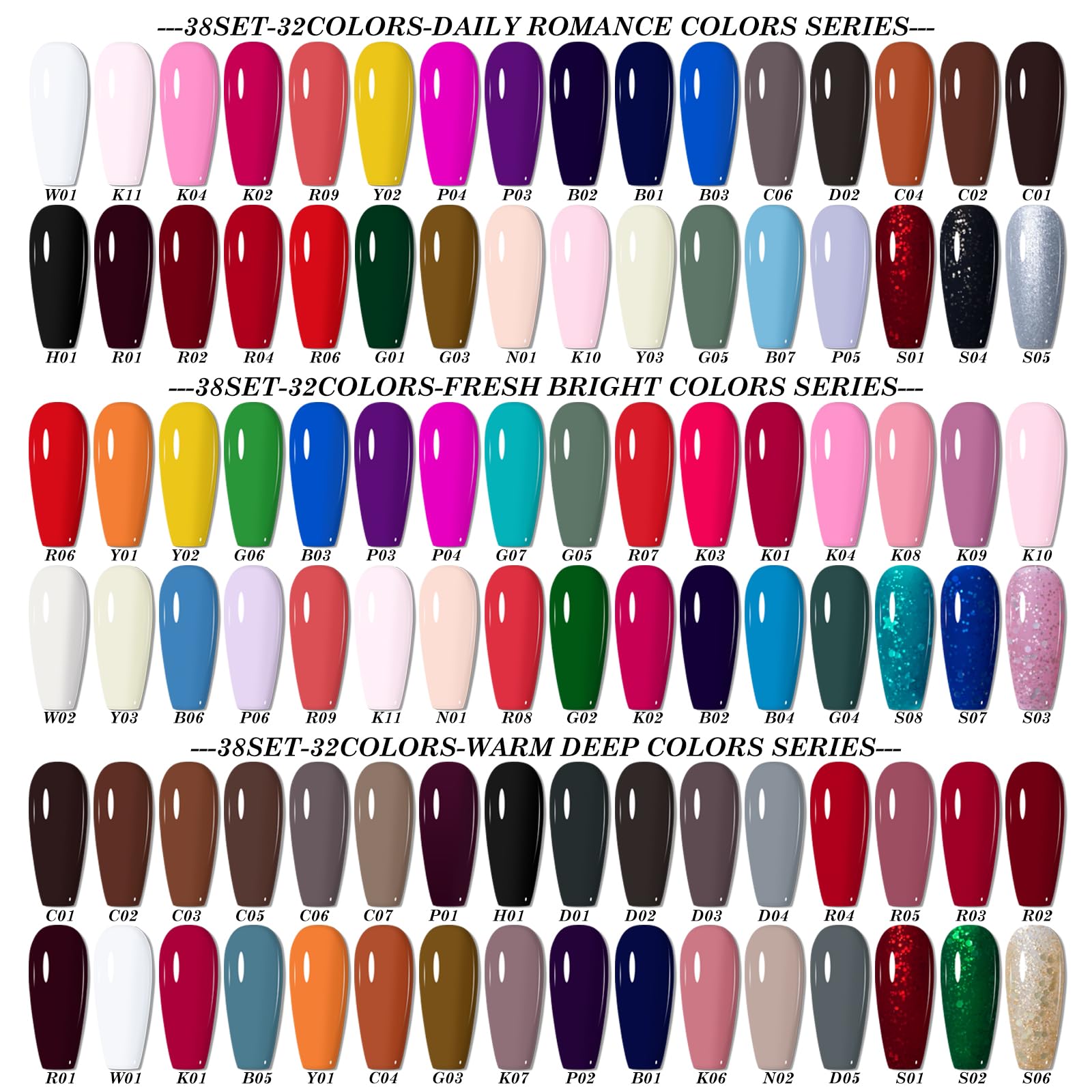- Neon Bright Colors Series: Our gel nail set includes 32 colors gel polish, 6 x no wipe base coat and glossy & matte top coat, gold & silver glitter top coat, builder gel(6ml each bottle). This set features neon and pastel shades predominate, such as neon pink purple blue red orange and pastel yellow light pink green. Selected from the latest fashion and trend culture, come and enjoy your DIY works!