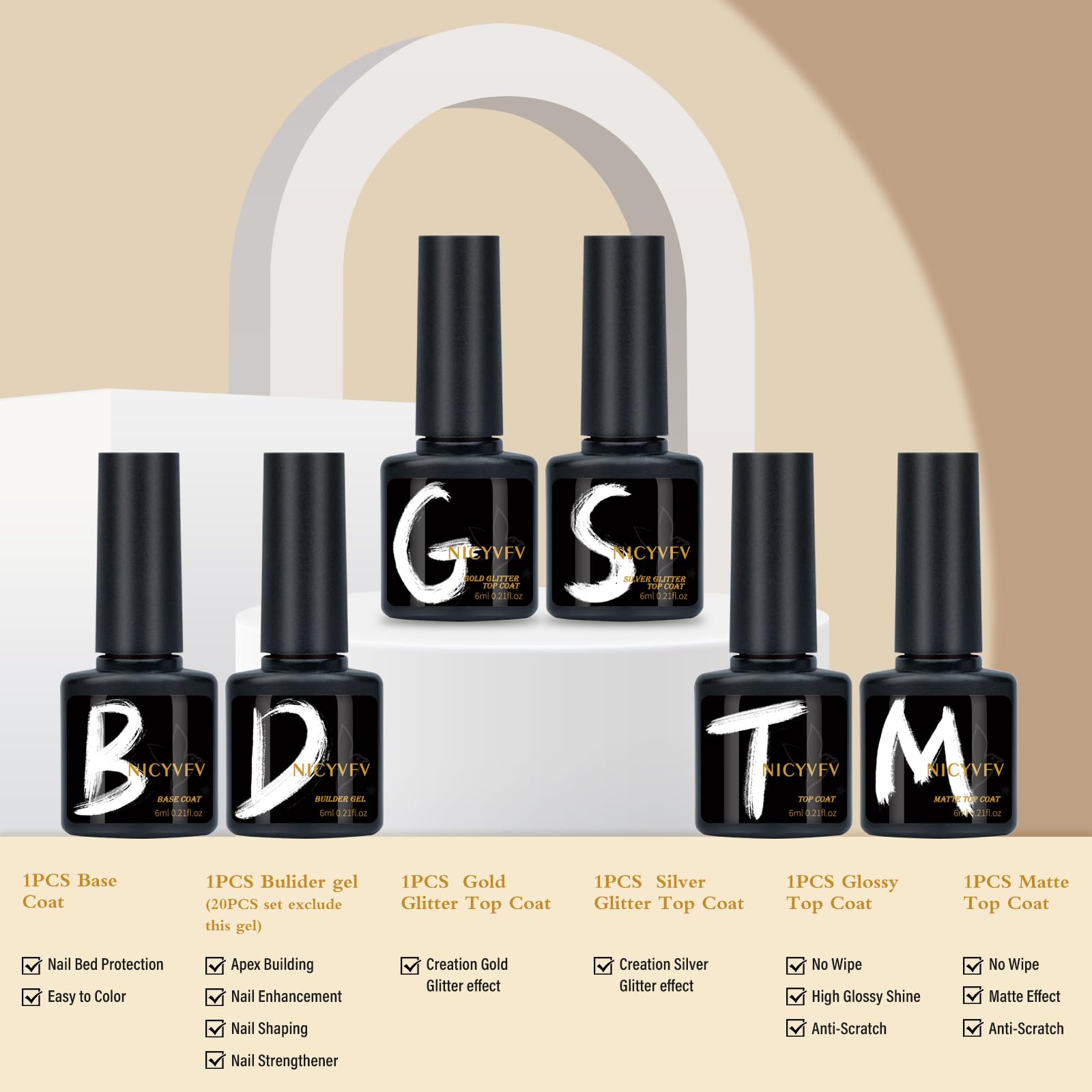 NICYVFV 38 PCS Gel Nail Set, 32 Colors Gel Polish Set Neon Pastel Shades, with Gold Silver Glitter and Glossy Matte Top Coat, Base Coat Builder gel, for Women Gift Kit