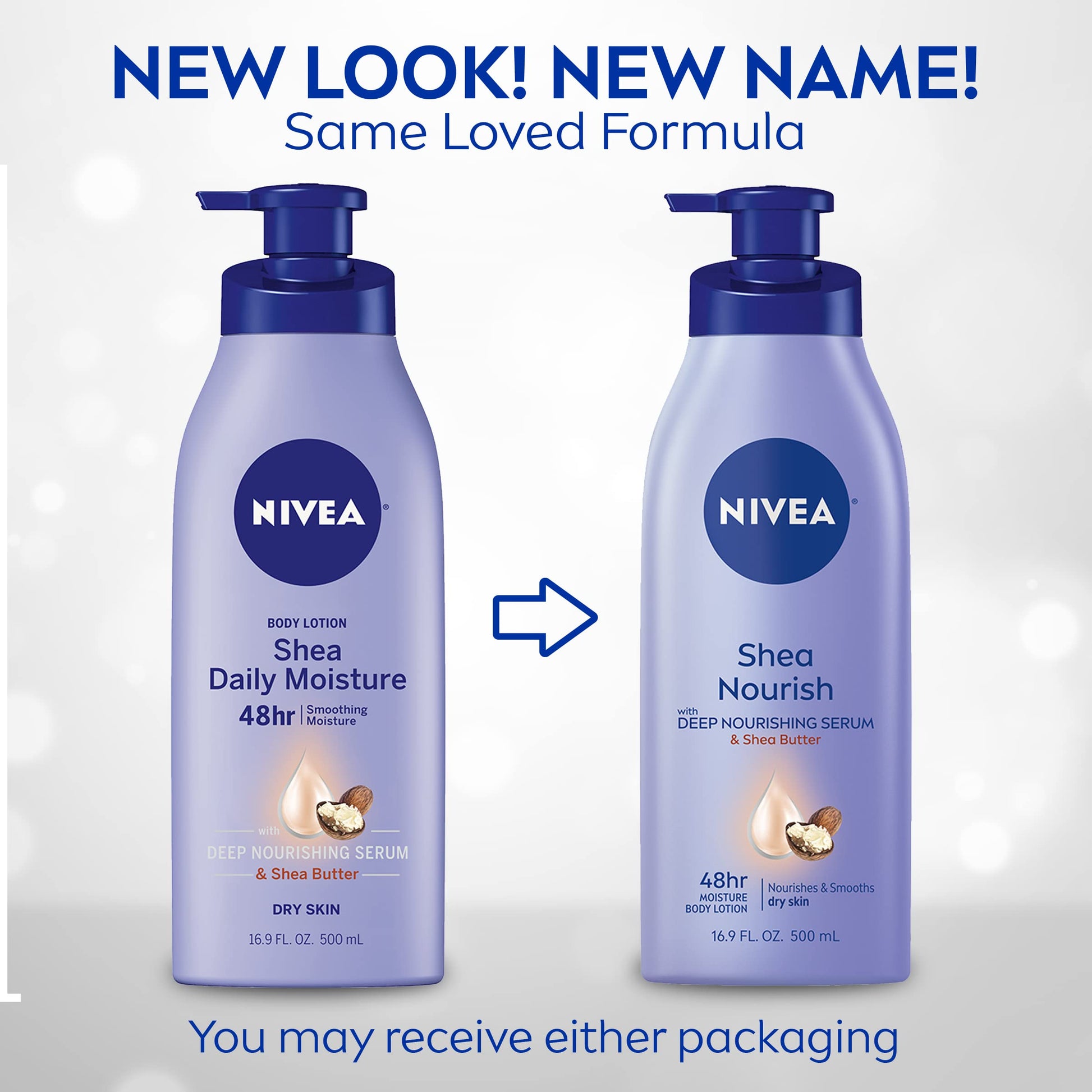 - INCLUDES: One 16.9 fluid ounce bottle of NIVEA Shea Nourish Body Lotion with Hyaluronic Acid, New Look and Formula