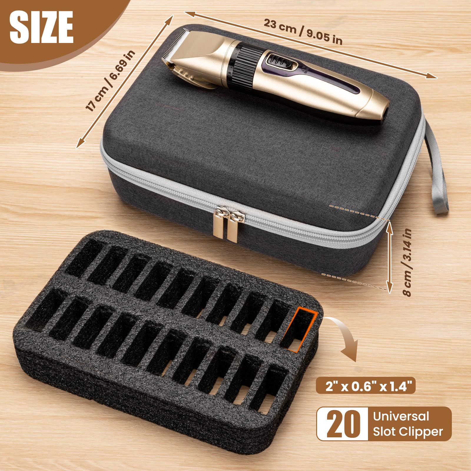 - 【Separate Storage】-- It features shock-absorbing foam dividers. With overall dimensions of 9.1x6.7x3.2inch / 23x17x8cm, safely store up to 20 professional detachable metal clipper blades and hair cutting accessories. Each blade is securely stored, with clearly marked compartments to keep everything organized. The foam dividers prevent the blades from colliding, reducing wear and tear. Provides ample space for all essential styling tools for quick access. This is an ideal choice for busy stylists