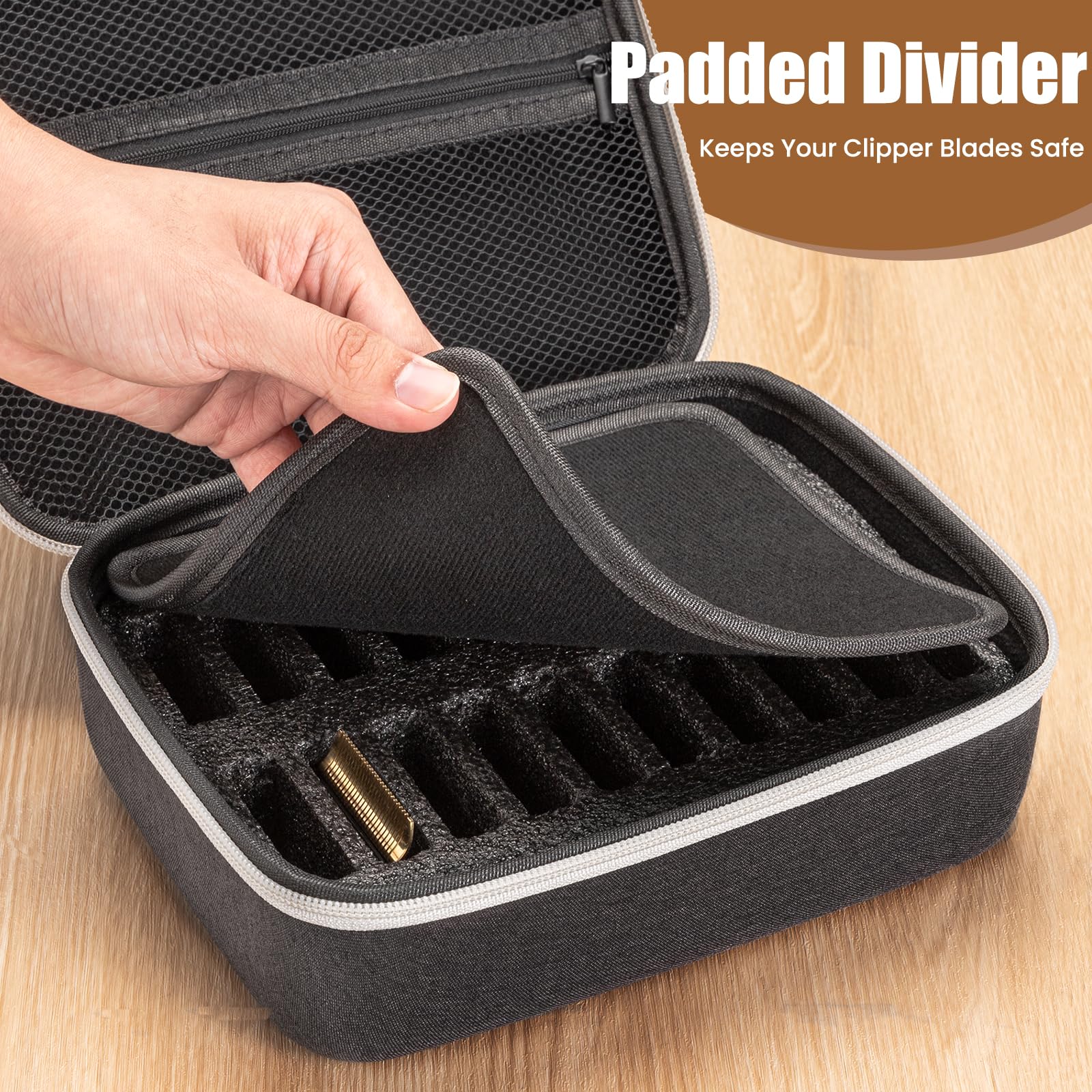 - 【Excellent Design】-- The case is equipped with dual zippers. Two zippers flank each side so you can open either way. The durable and smooth double zipper to ensure long-term durability, not easy to break off. Inside the lid, it has a zipper storage area, which can hold another clipper or scissors or a cape. The interior also features a padded divider, so when you open the case, your hands won’t come into direct contact with the blades, preventing accidental cuts and keeping the blades sharp