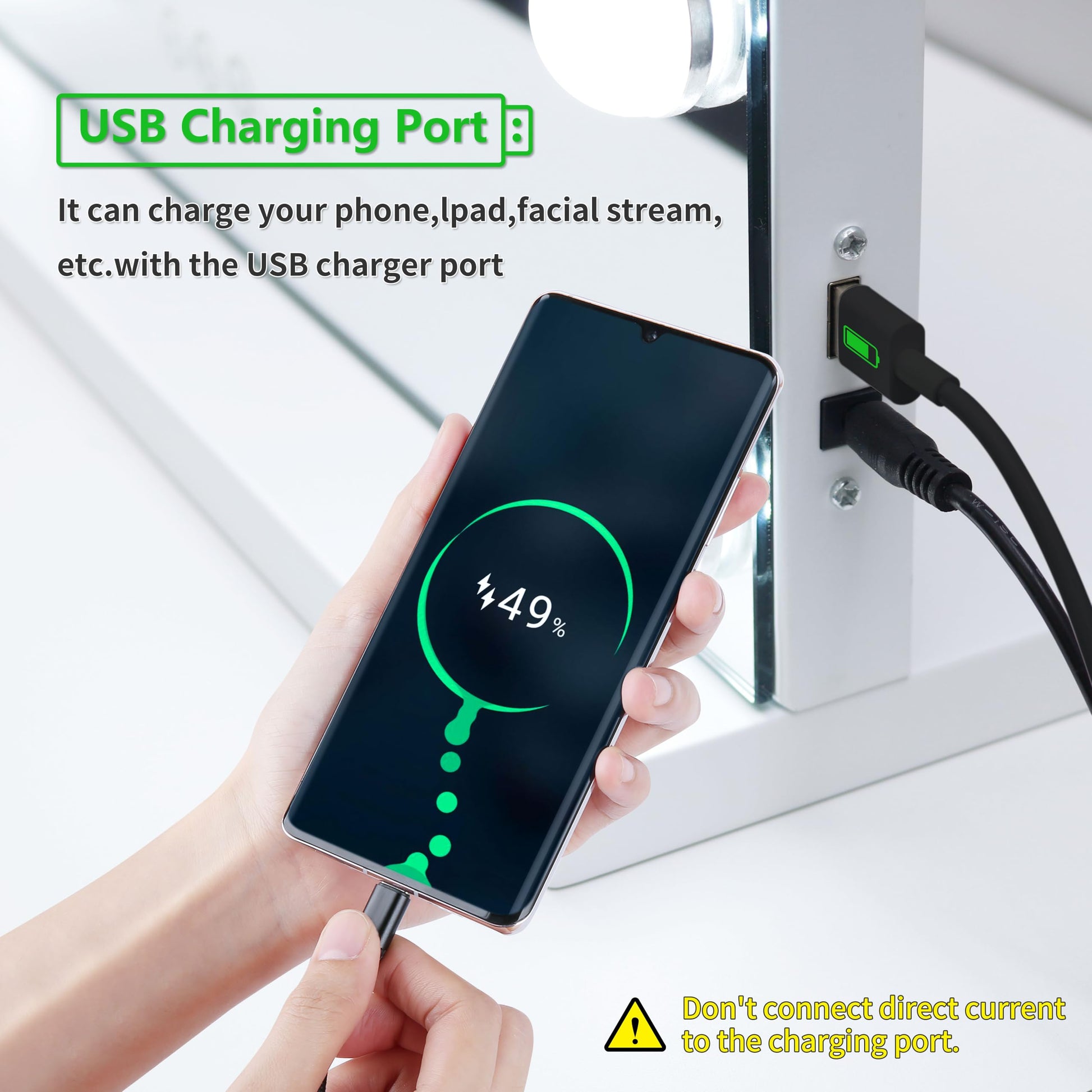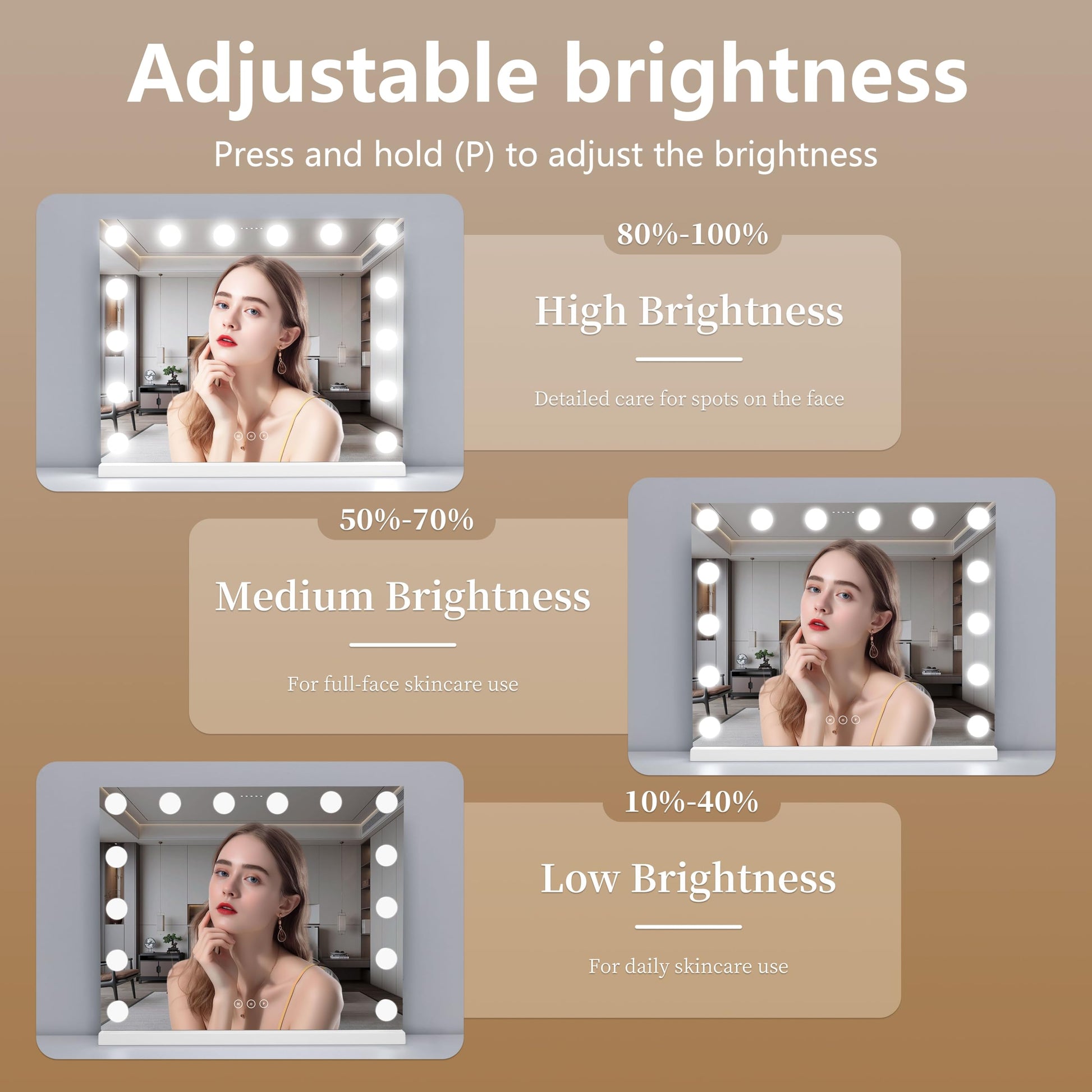 - 【 Ajustable Brightness & 3 Colors Lighting Modes 】- The LED brightness of this hollywood lighted makeup mirror can be changed as you need. This LED makeup mirror provides 3 colors lighting modes so that you can also adjust different brightness to meet your different makeup needs, no matter it is early morning or late night.