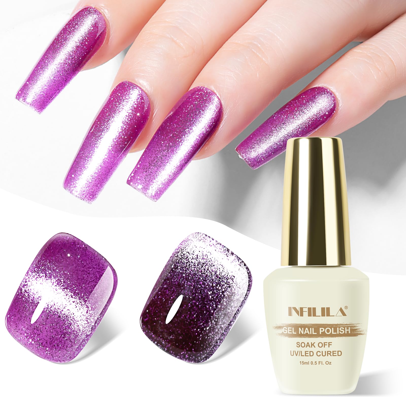 NXJ INFILILA Cat Eye Gel Nail Polish, 0.5 oz Magnetic Gel Nail Polish, Purple Glitter Holographic, Soak Off Salon Gel for Home Use (G06)