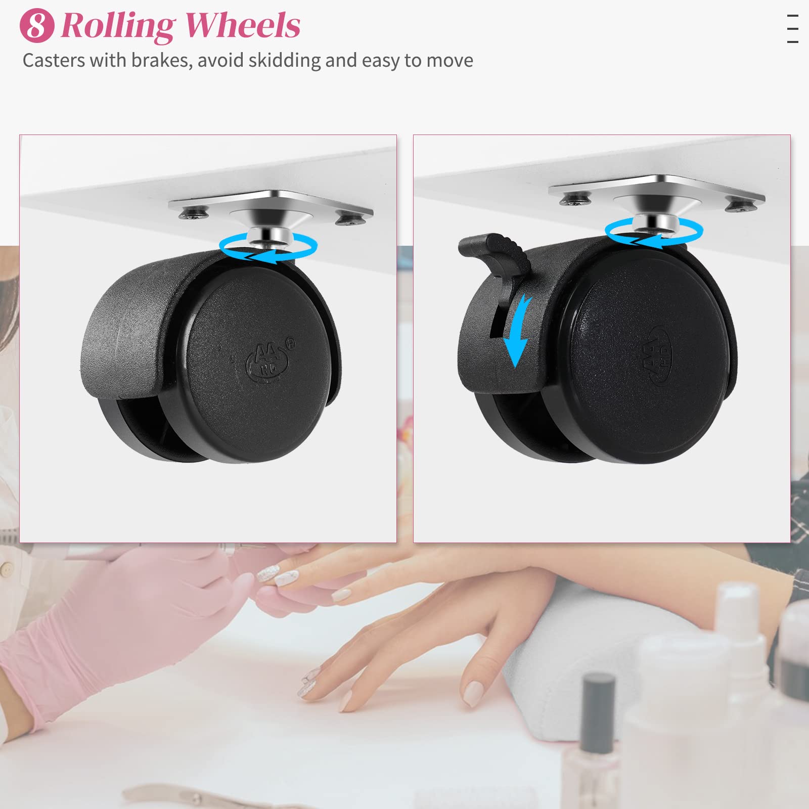- 【MOVABLE & LOCKABLE NAIL TABLE】- The manicure table is designed with 8 rolling wheels, you can easily move it from one place to another. Besides, 4 of the wheels are lockable to enhance the stability of the table. You just press the button on the wheel and the table will stay where you want it to be.