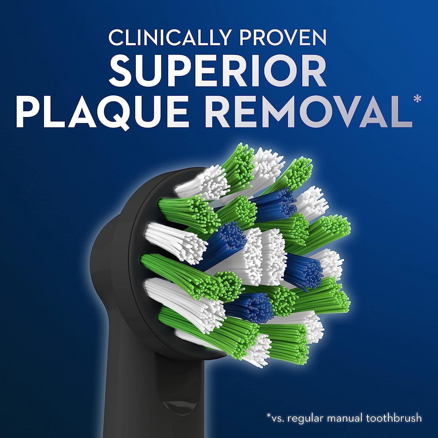 Details: The Oral-B CrossAction Black electric toothbrush replacement head features perfectly angled bristles to remove 100% more plaque for a superior clean*. The round brush head is inspired by dental professional tools for a tooth-by-tooth clean, with specially engineered bristles. Max Clean Bristles change from green to yellow to signal when to change your brush head to maximize your clean. Dentists recommend changing your brush head every 3 months. *vs. a regular manual toothbrush