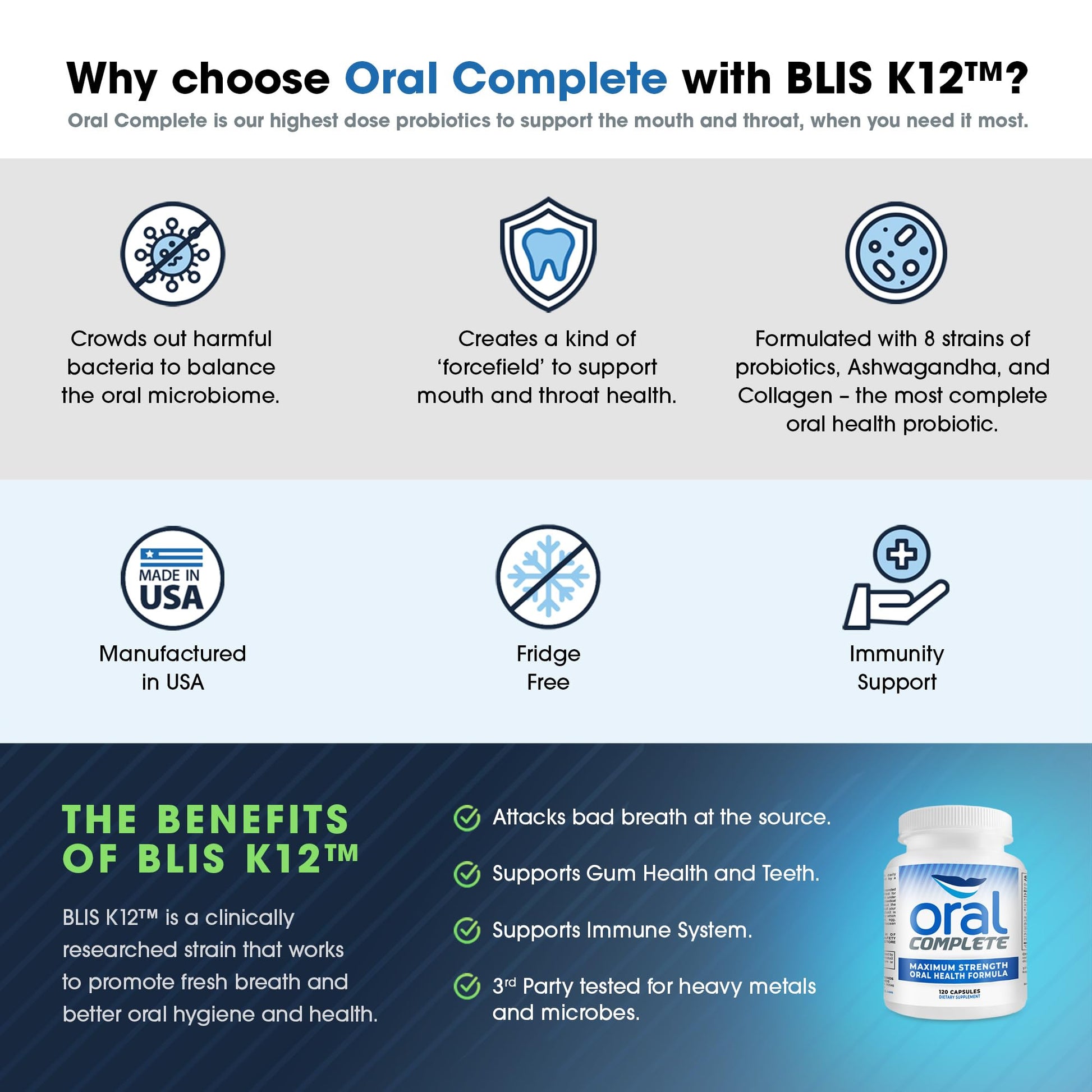 Oral Complete 11-in-1 Dental Probiotics, Bad Breath Treatment Halitosis Tonsil Stone with Non-GMO with BLIS K12, Ashwagandha and Collagen, 120 Capsules