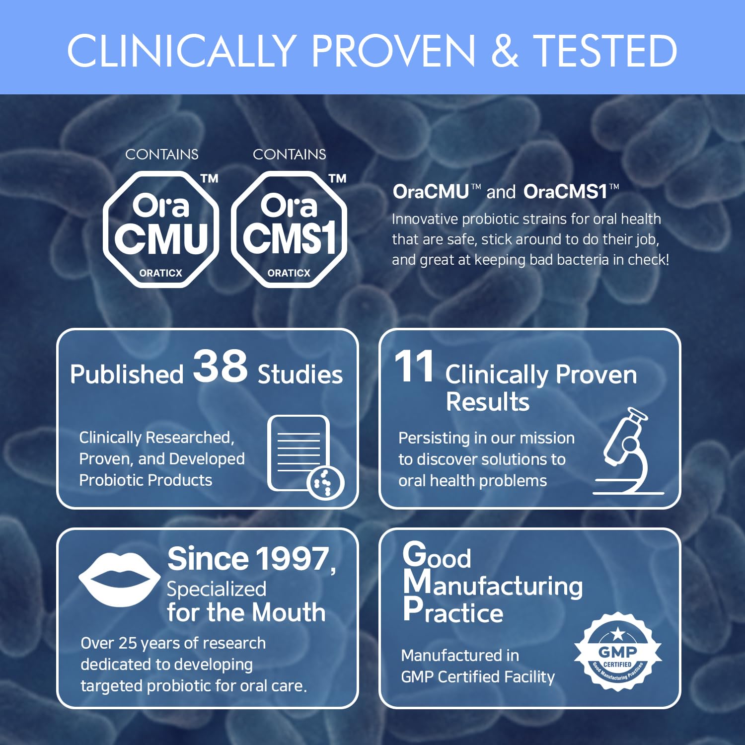 - PREMIUM DENTAL PROBIOTIC - Our patented oral probiotic strains oraCMU & oraCMS1 are the results of years of research, and these clinically studied probiotics support healthy teeth n gum and immunity.