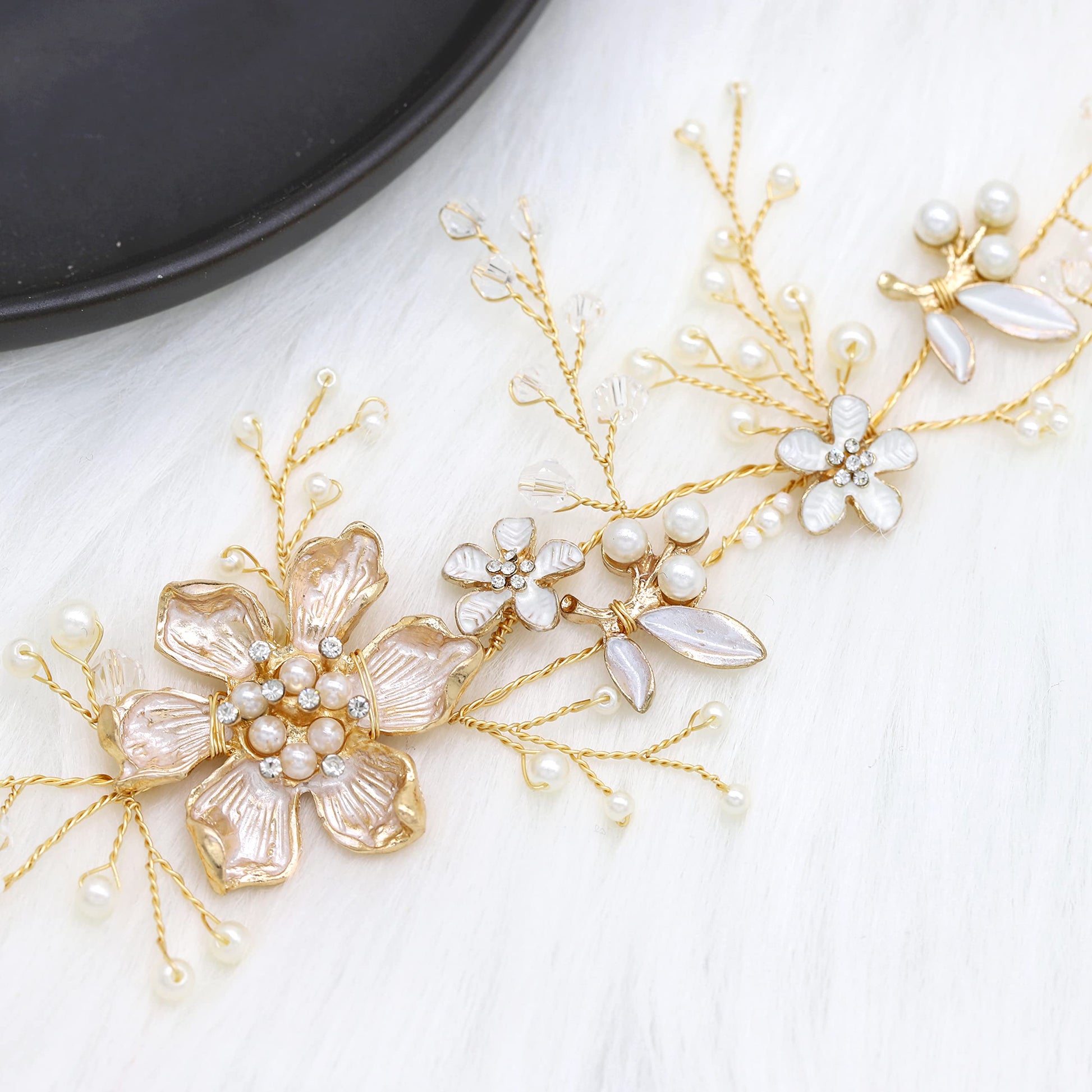 Oriamour Bridal Headpieces Flower Design With Pearls Wedding Headbands Hair Vines For Brides Women Girls Wedding Party (Gold)