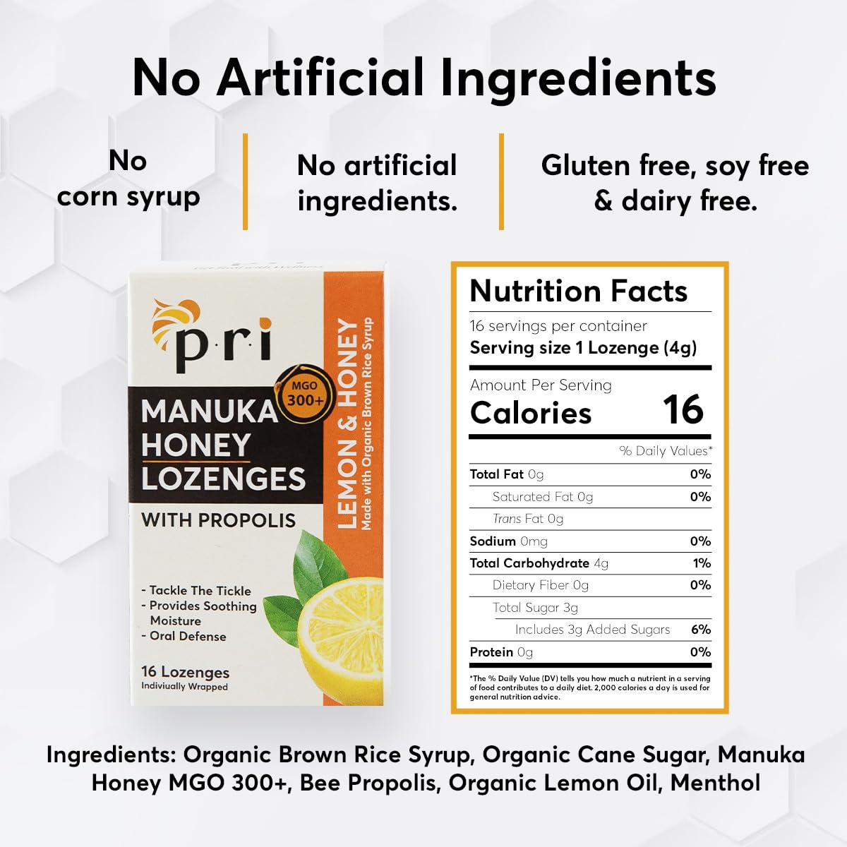 P.R.I Manuka Honey Lozenges with Propolis, Soothing Cough and Throat Drops, MGO 300+ Certified, (Lemon, 16 Count/2 Pack)