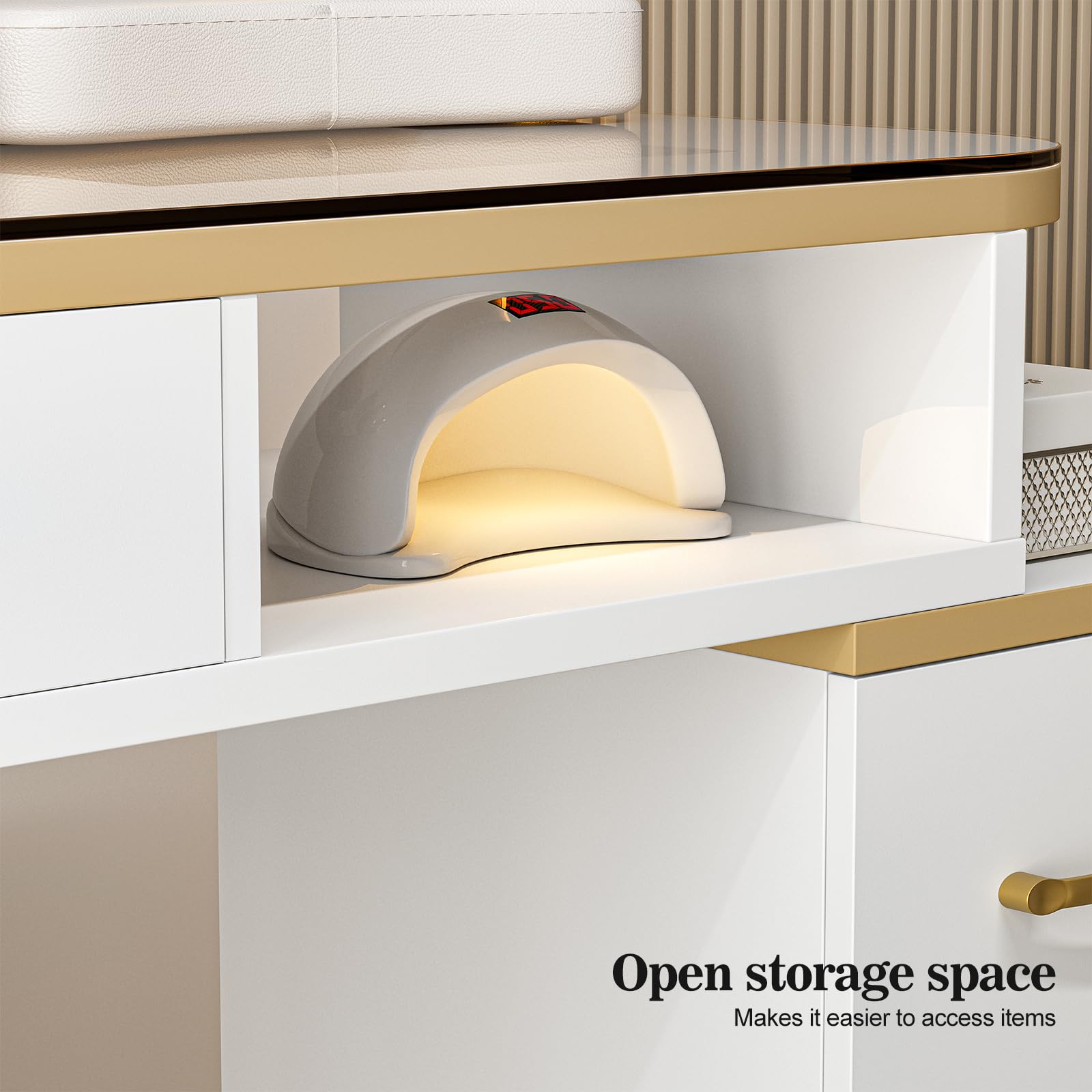 - 【LARGE STORAGE SPACE】This professional nail table has 3 large capacity drawers for storing large items. The visible drawer of the tabletop can store nail polish and frequently used tools. In addition to this there are 2 open storage shelves on one side that can be used to store towels, hand creams, nail polish remover and other items