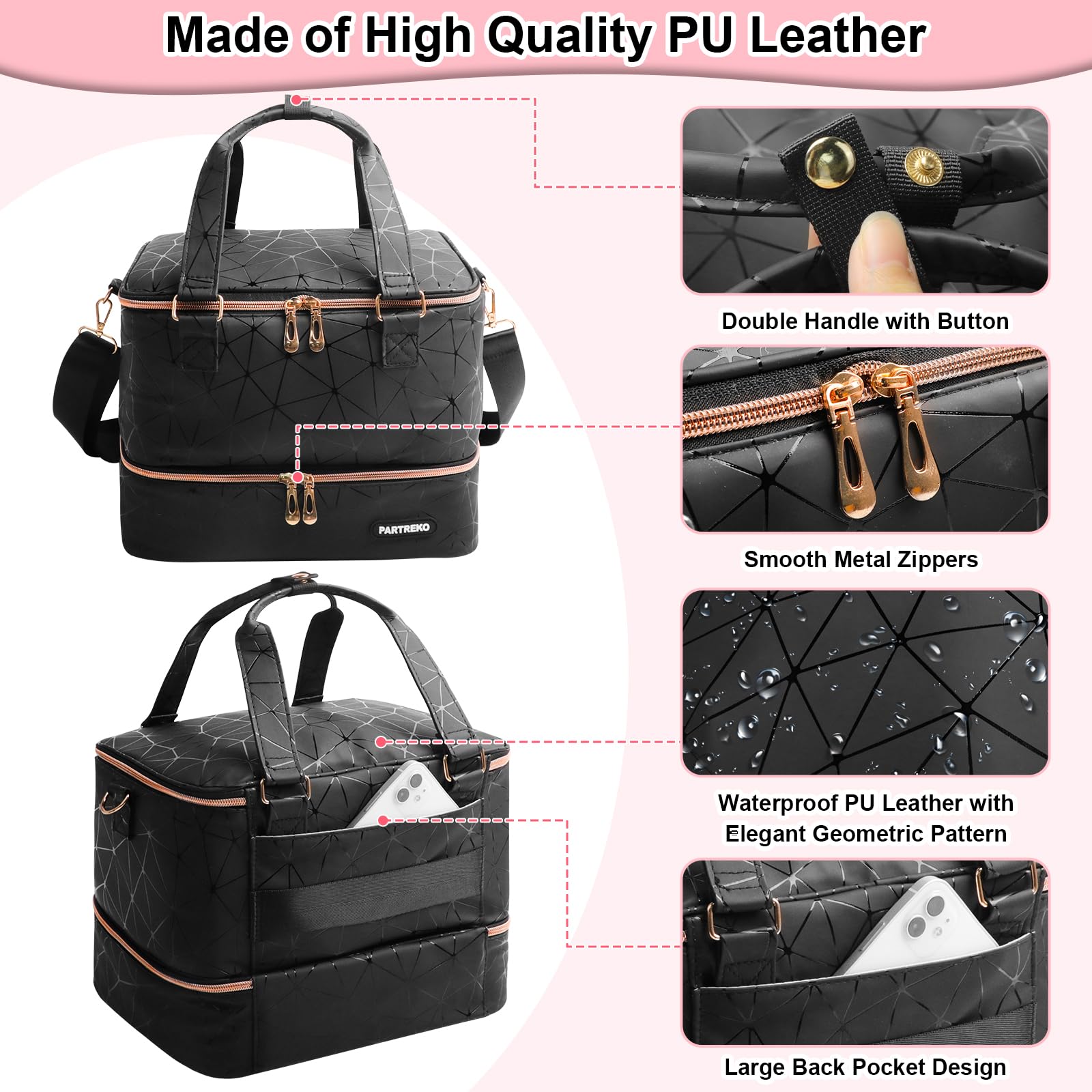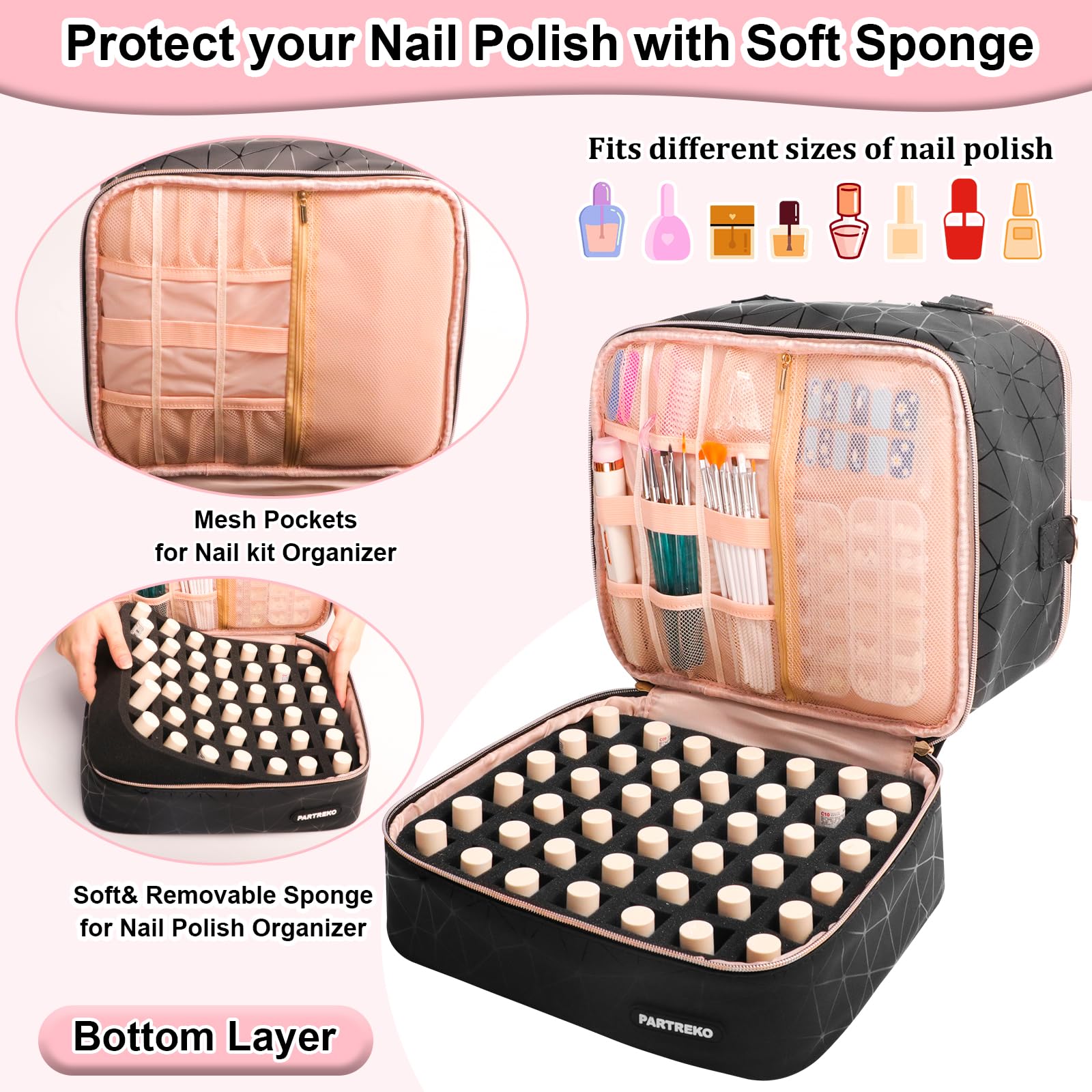 Partreko Large Nail Polish Organizer Fits 54 Bottles (15ml-0.5 fl.oz)& Nail Lamp, Double Layer Nail Supplies Organizer Bag with Holder Strip, PU Leather Nail Kit Storage Travel Case for Women (Black)