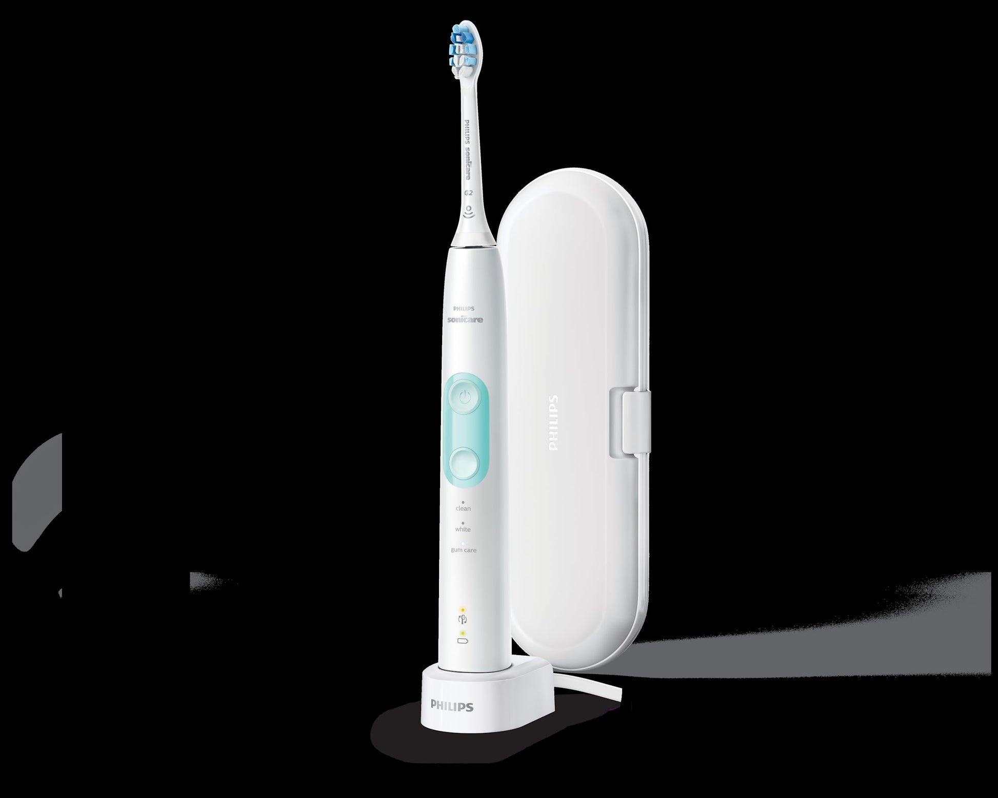 Details: The Philips Sonicare ProtectiveClean 5100 electric sonic toothbrush offers a significant improvement in your dental hygiene routine, promoting wellness by enhancing your gum health up to 100% and removing 3x more plaque along the gumline vs. a manual toothbrush. With a pressure sensor and 3 brushing modes, this electric toothbrush is tailored to protect sensitive gums and optimize your brushing experience. Clean mode is standard for superior cleaning, White is the ideal mode for removing surface stains, and Gum Care mode adds an extra minute of reduced-power brushing, so you can gently massage your gums. The G2 Optimal Gum Care brush head provides effective clean while being gentle on gums. The 2-minute Smartimer and QuadPacer help you achieve a dental professional-recommended brushing time, promoting optimal oral health. The Philips ProtectiveClean 5100 is a reliable companion, at home or on the go − it works perfectly as a travel toothbrush as well. The set includes a travel case and a charger to maintain its long-lasting lithium-ion battery that operates for up to two weeks on a single charge. The BrushSync technology tracks how long you've been using your brush head for, and how hard you've been brushing.The BrushSync replacement reminder on your handle and a short beep gives you a heads up when it's time to replace the brush head. With its sleek white design and ergonomic handle, the Philips ProtectiveClean 5100 not only prioritizes your oral health but also delivers comfort and durability, making it a smart addition to your wellness routine. Make the switch to a Philips Sonicare toothbrush and feel the difference.
