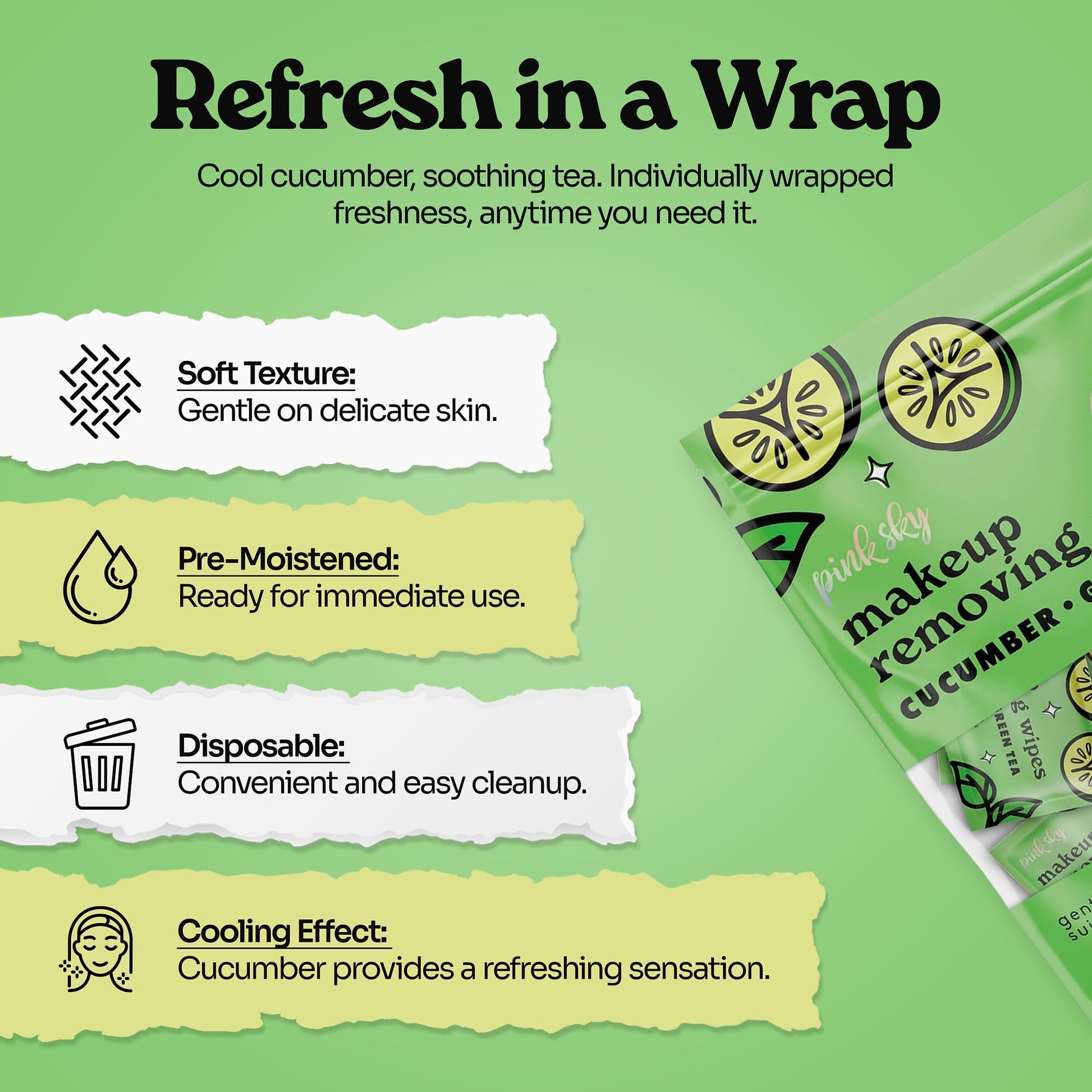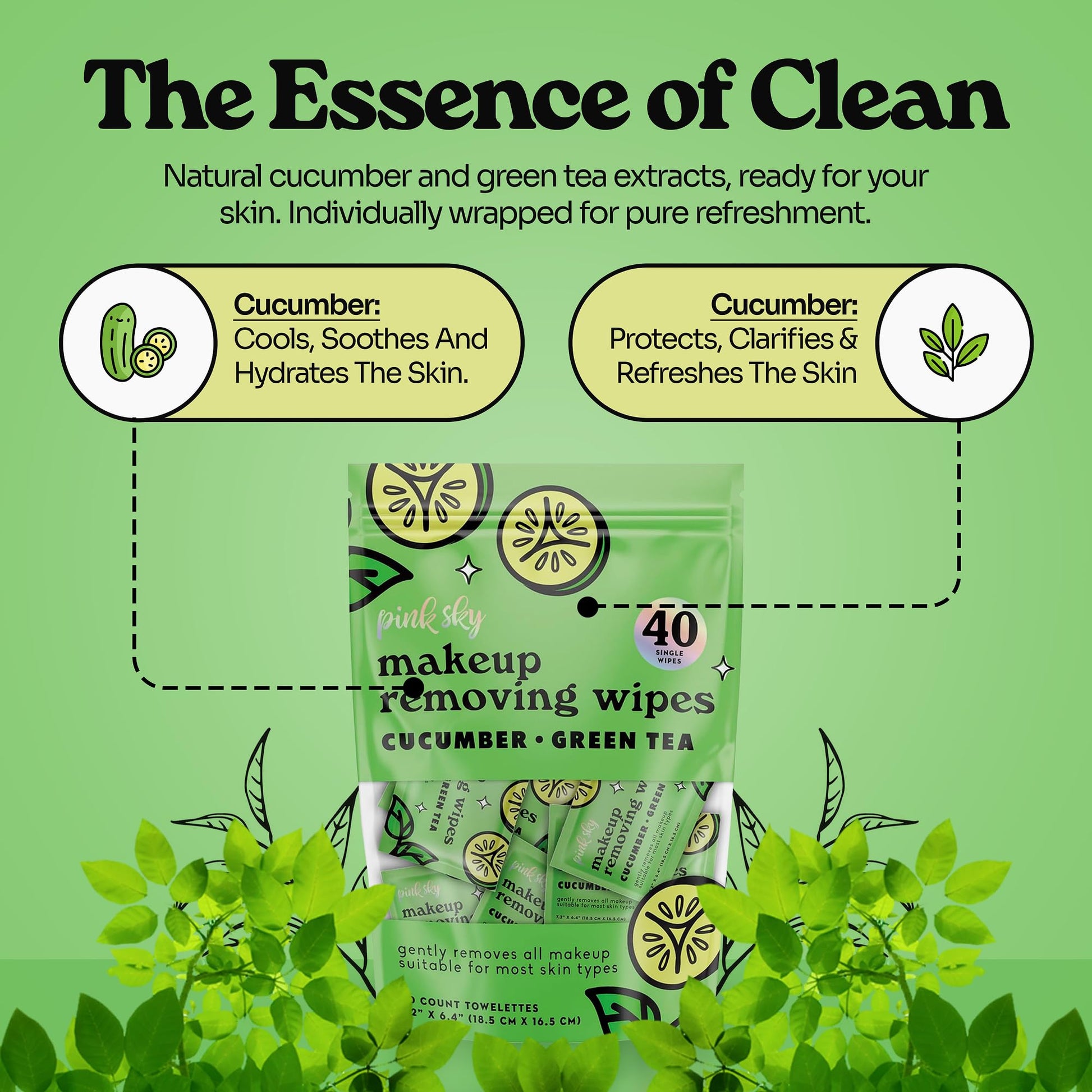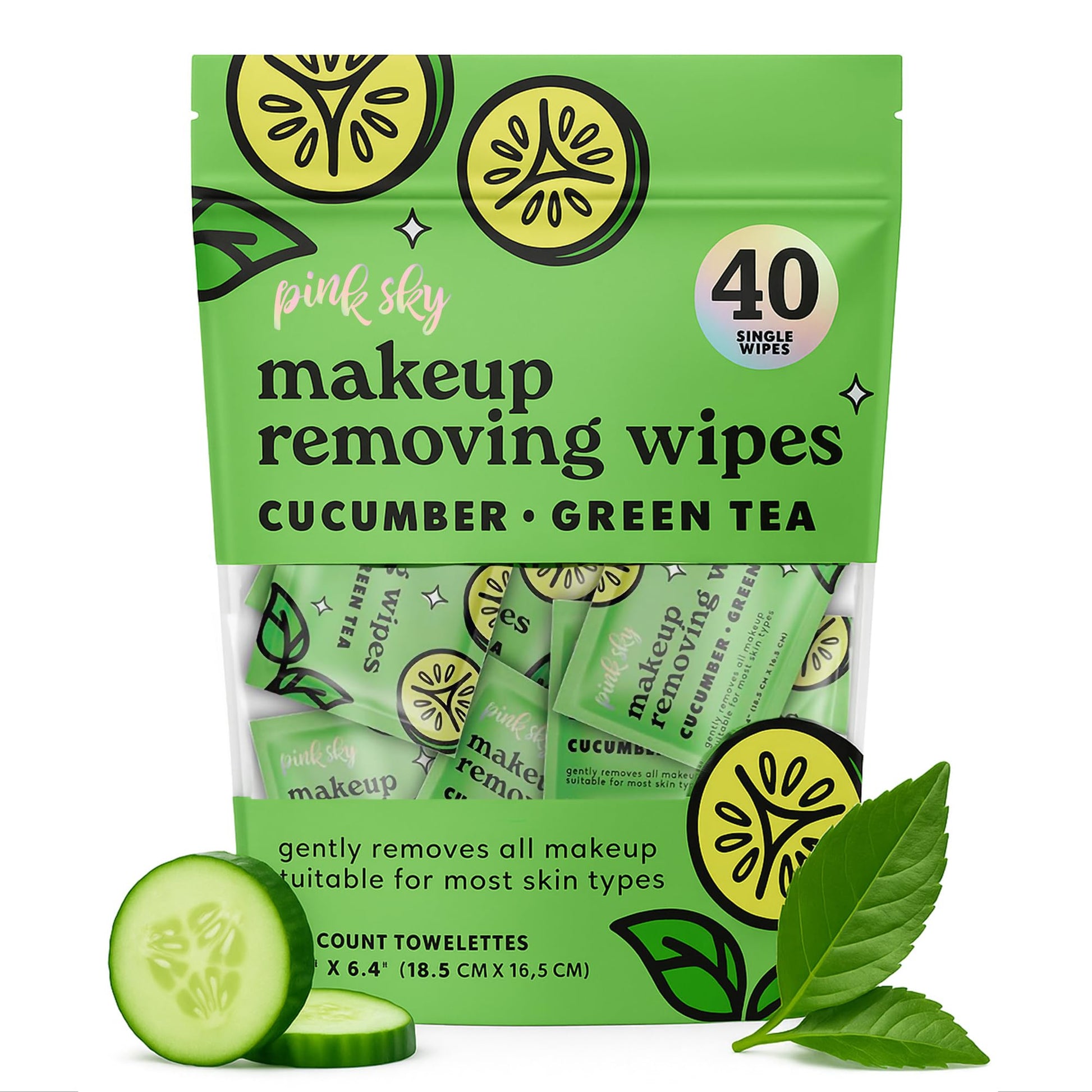 Pink Sky Makeup Remover Wipes for Face - Ultra Soft, Mini Makeup Wipes Individually Wrapped, Travel Makeup Wipes, Gently Cleanse & Remove, 40 Count (40 Wipes, CUCUMBER & GREEN TEA)