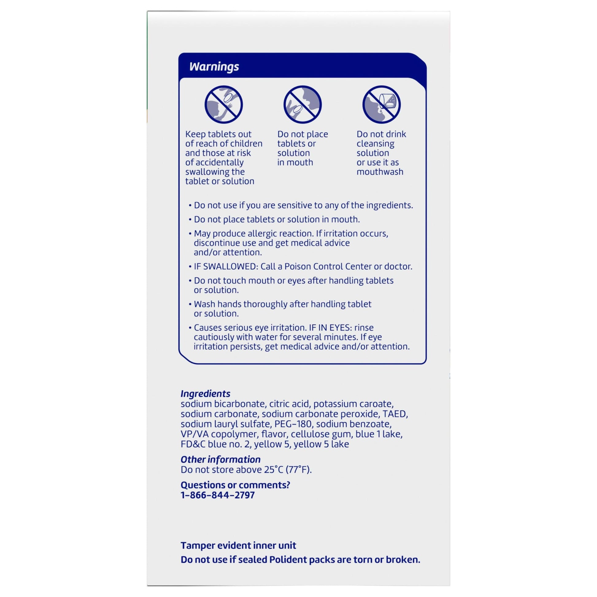 Details: Introducing an improved formula (1) from Polident, the #1 Dentist Recommended Dental Appliance Cleansing Brand, now with more active power bubbles (1) for an amazingly clean dental appliance every day! Polident Overnight Whitening Antibacterial Dental Appliance Cleanser delivers effective stain removal without brushing with a specially designed formula for dental appliances, including full dentures, partial dentures, retainers, aligners, and mouthguards (3). Offering a 360-degree deep clean (4), the active power bubbles in Polident Dental Appliance cleansers actively clean even the hardest to reach places (2) and keep your dental appliance fresher for longer (5). Use daily as directed for the best clean and a clean, fresh, healthy smile. (1) Vs. previous Polident range (2) In laboratory tests (3) Suitable for common dental appliances (4) When used as directed (5) Vs. no tablet