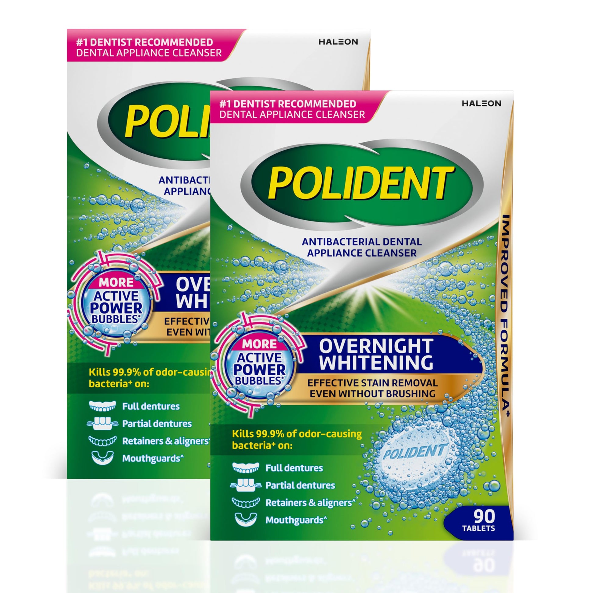 - Two 90 count boxes of Polident Overnight Whitening Antibacterial Dental Appliance Cleanser Tablets