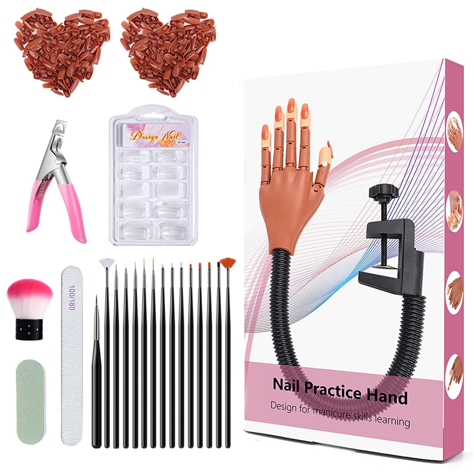 - 【Package & Service】1 Nail Training Practice Hand & 200 pcs refill nail tips, 100pcs Transparent Half cover French Nail tips, 1 pc 100/180 Grit Nail file, 1pc sponge nail buffer, 1pc nail clipper, 1pc nail dust brush, and 15pcs nail art brush pen. All items are good quality product. Your satisfaction is our top priority; any quality issues please feel free to contact us, we will do our best to meet your satisfaction