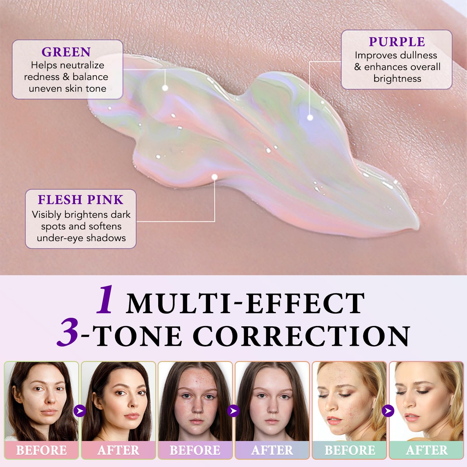 - ♥ Highly Effective Sunscreen + Perfect Concealer 2 In 1: Makeup primer with SPF50+/PA ++++ provides broad-spectrum protection, lower than UV rays, three-color correction technology targeted to solve the problem of skin tone, achieve the “sunscreen + primer in one step” to simplify the steps of skincare.