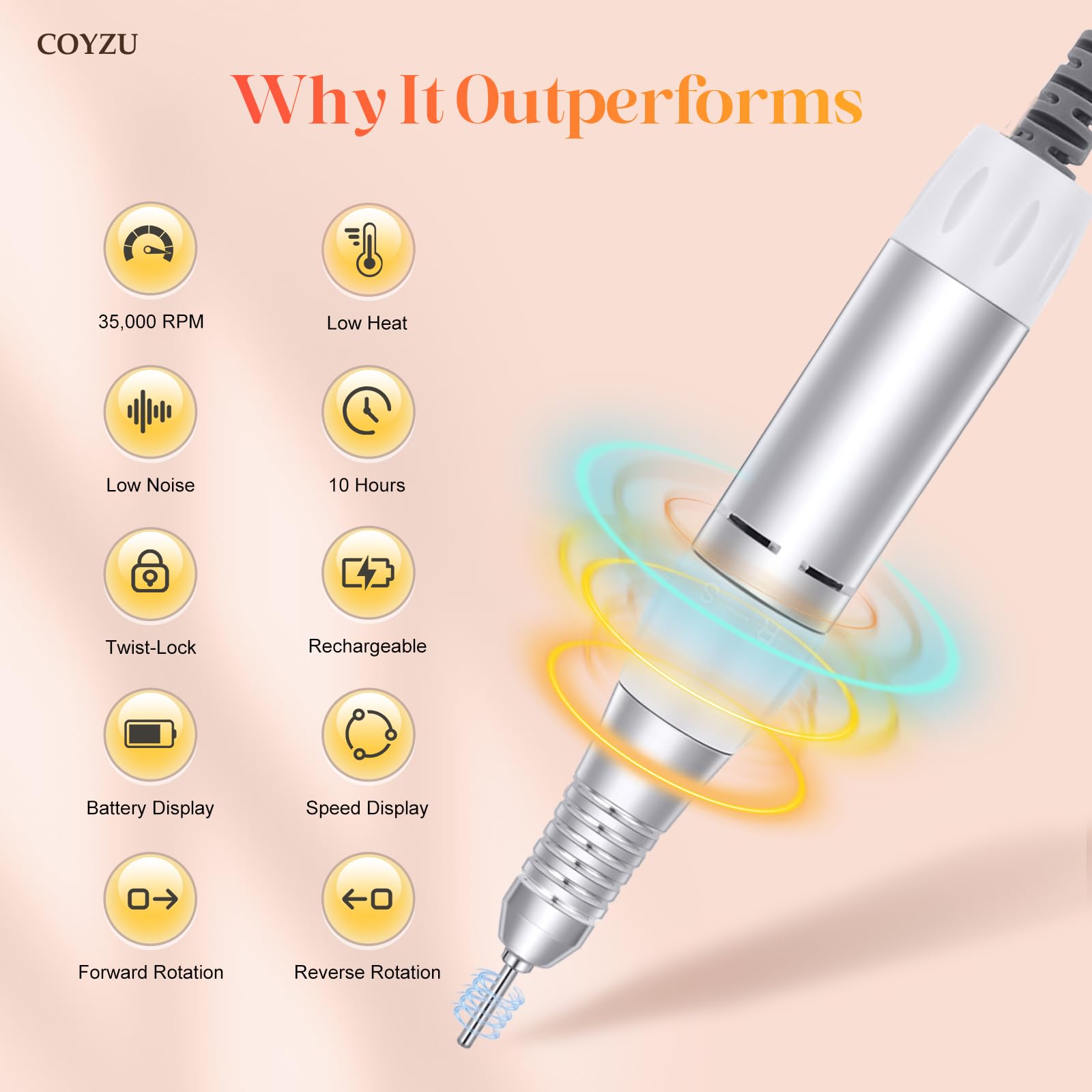 Professional Nail Drill Electric File:COYZU 35000RPM Portable Cordless Nail Drill Machine with Bits, Rechargeable E File for Acrylic & Gel Nails, Manicure & Pedicure Tech Tool for Home Salon, White