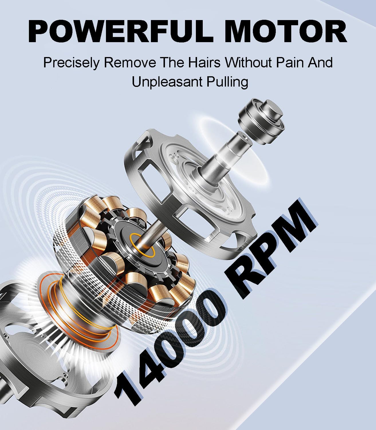 - POWERFUL COPPER CORE MOTOR AND PAINLESS: The nose hair trimmer features an enhanced copper-core motor with a 360° dual-blade system, powered by a 14,000 RPM motor. Its allergy-resistant stainless steel blades trim safely without pulling or harming hair