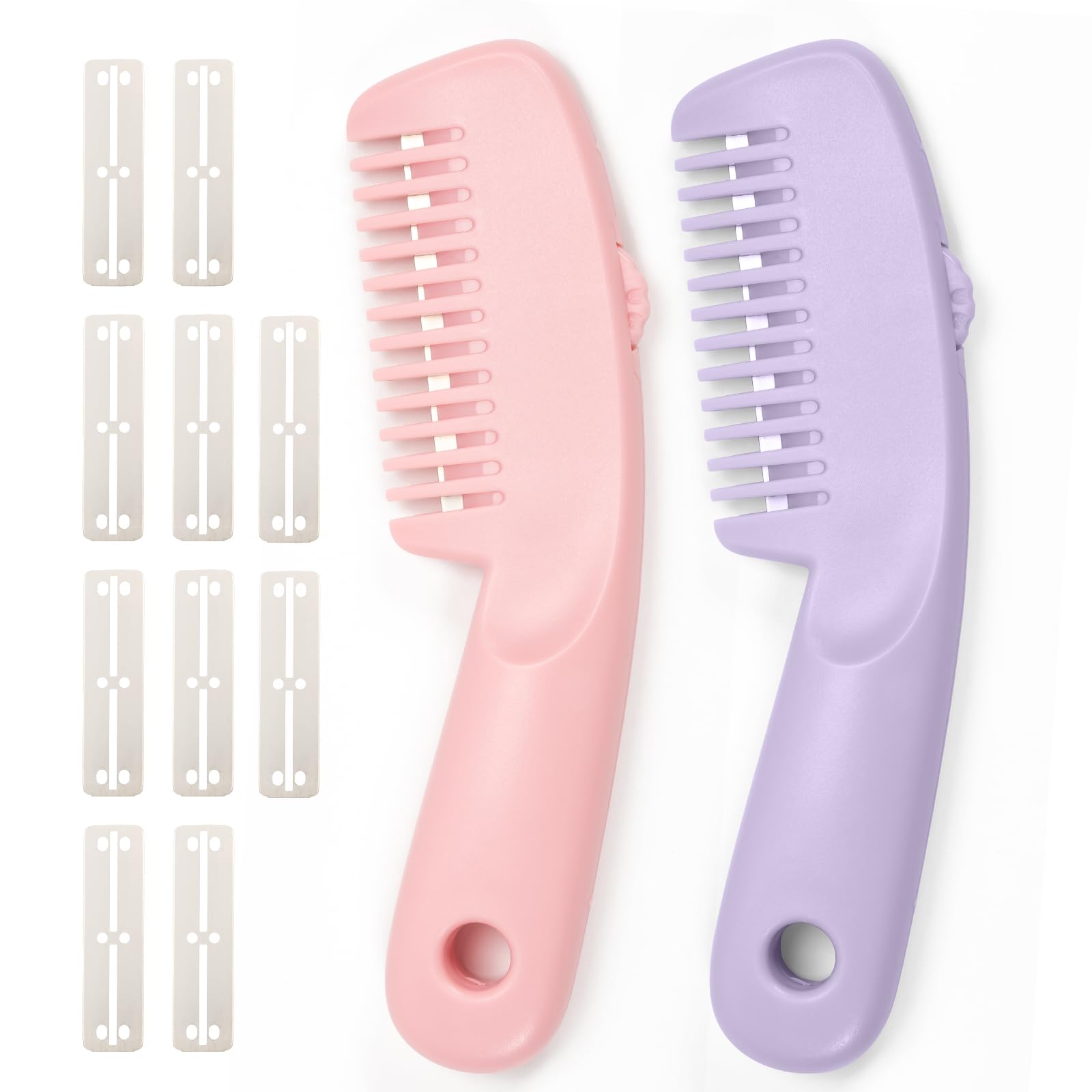Razor Combs for Hair Cutting Women, 2 Pack Hairs Thinning Comb with 10 Pieces Blades, Split End Trimmer for Thick Hair (Purple and Pink)
