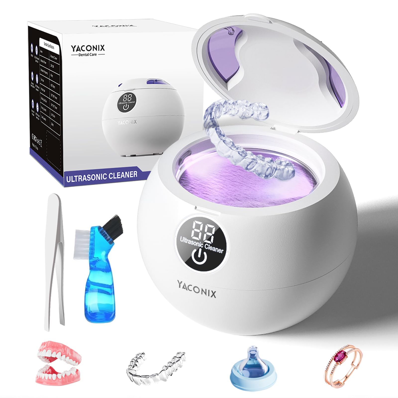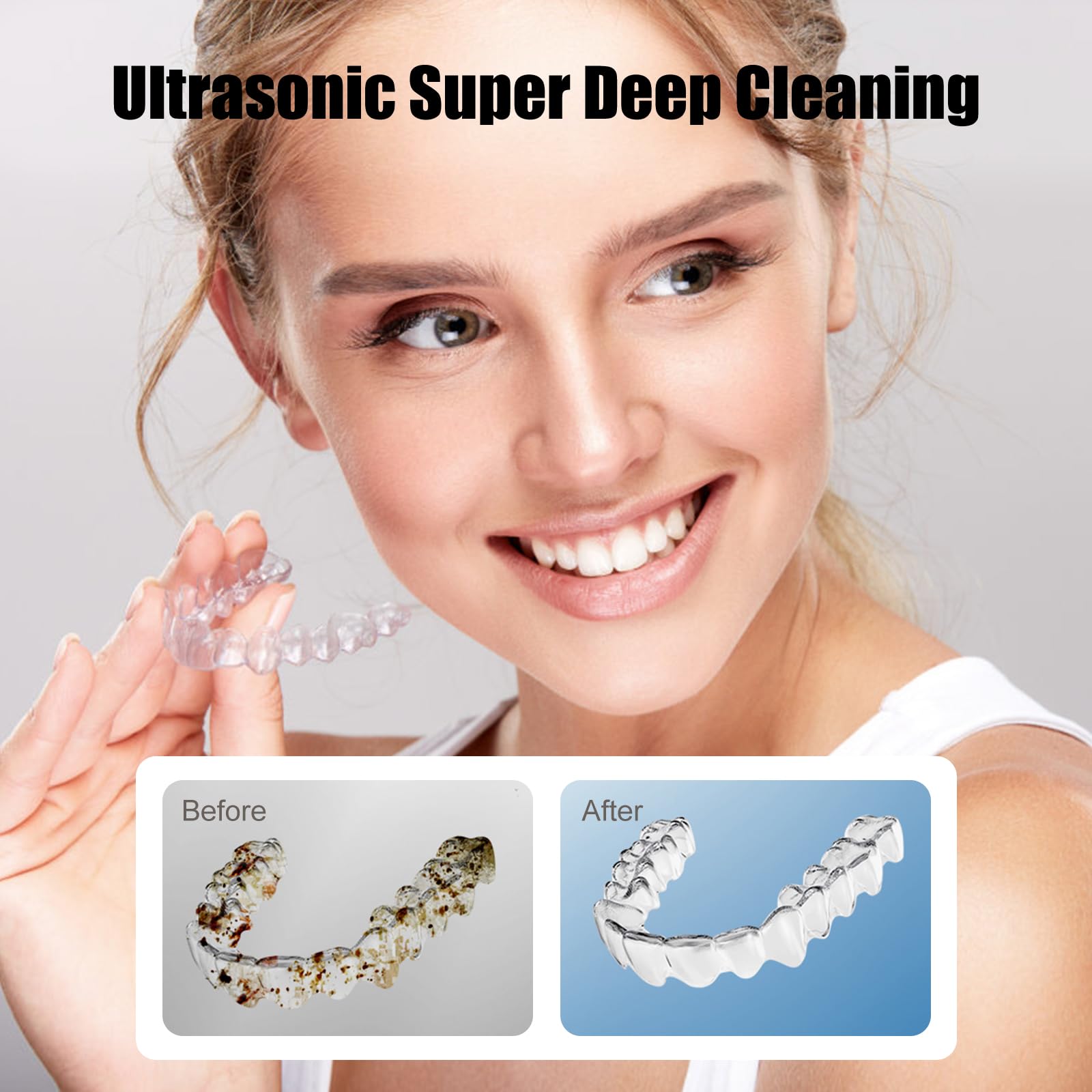 - 【45Khz Highly Eiffcient Retainer Cleaner】retainer cleaner machine from us use 25W high-efficiency power and 45kHz frequency technology to provide 360-degree deep cleaning for retainers, dentures, braces, night guards , dental aligners, and mouth guards. generates millions of tiny cleaning bubbles, penetrating crevices and grooves in dental appliances and jewelry.thoroughly clean stains and dirty things. Use with cleaning tablets, mouthwash, or professional solution for better results