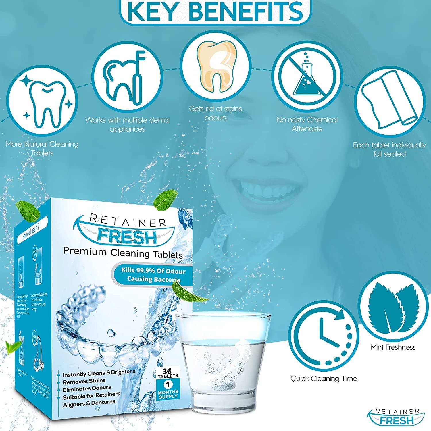 - Eliminates 99.9% Of Stains, Odours & Discolouration - Retainer Fresh tablets use ingredients that restore your dental appliance helping tartar removal leading to perfect brite clean items.