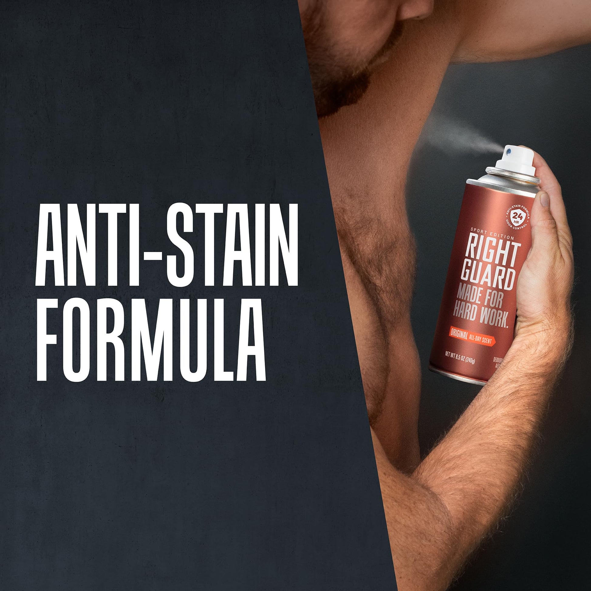 Details: You don't back down from hard work, so we crafted an anti-odor solution that's just as determined as you are. Meet Right Guard Sport spray deodorant for men. Understanding the rigorous demands that come with the job, we've developed a men’s deodorant spray that’s built for the workday. Our invisible armor offers 24-hour protection against odor, so you can focus on getting the job done without any distractions. Crafted with care, Right Guard deodorant has an anti-stain formula so you don’t spoil your uniform or your good t-shirt. Our mens deodorant spray comes in our Original all-day scent, specially designed to let you work harder and still smell fresh. Whether you're on the job, sizzling steaks on the grill, or chasing little ones in the yard, Right Guard Sport Spray Deodorant is the perfect grab-and-go deodorant to make sure you're covered wherever you are. Choose Right Guard Sport Spray Deodorant and experience the job done right.